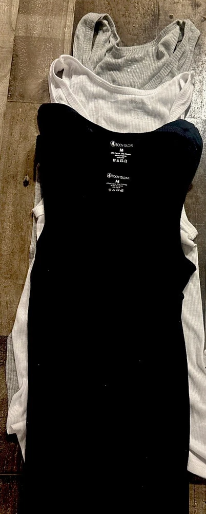 Elevate your activewear game with this variety of 4 Body Glove tank tops in size medium. Perfect for any occasion, these sleeveless undershirts are made of 100% cotton knit fabric, ensuring comfort and durability during any performance or activity, whether it be cycling, baseball, cross training, crossfit, basketball, bodybuilding, or a day at the beach. The tagless accents provide an added layer of comfort, making these tanks ideal for both boys and girls. The solid black color and athletic fit make these tank tops a versatile addition to any gym outfit. Whether you're a seasoned athlete or just starting out, these Body Glove tank tops are a must-have for any young athlete's wardrobe. So why wait? Add this 4-piece set to your cart today and experience the comfort and style that Body Glove is known for. 2 black, 1 white & 1 gray. Never worn