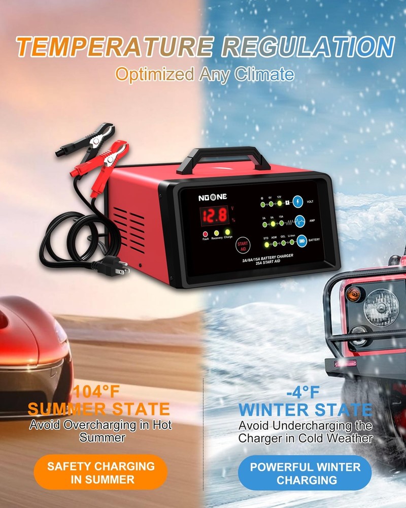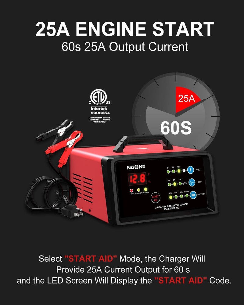 NOONE Smart Car Battery Charger: 2/8/15A Battery Chargers 6V/12V Boat Battery Chargers with Engine Start, Metal Shell, Winter Mode, Suitable for AGM, EFB,AGM, Lead Acid, Lithium (LiFePO4) Batteries Product Details Color: 2A/8A/15A Brand: Noone MPN: BTC-6015A UPC: 723884697219 EAN: 0723884697219 Brand: Noone Color: 2A/8A/15A Product Dimensions: 9"D x 8"W x 6"H Output Voltage: 12 Volts, 6 Volts Specification Met: ETL, FCC Manufacturer: NOONE Brand: Noone Item Weight: 5.14 pounds Product Dimensions: 9 x 8 x 6 inches Item model number: BTC-6015A Manufacturer Part Number: AMBT008-FBA004M Amperage: 15 Amps Date First Available: January 18, 2024 ETL CERTIFICATION AND MULTIPLE SAFETY PROTECTION :NOONE car battery charger has passed the strict ETL certification, and the charger has multiple protections such as spark, reverse polarity, overcharge/overdischarge, overvoltage, overcurrent, overload, overheat, reflow, short circuit, and so on. Protect you and your car SUPER HIGH CONVERSION EFFICIENCY : The 2A/8A/15A battery charger's adopts upgraded high frequency chip, the conversion efficiency is up to 89.3%, which is higher than other battery chargers with 65% conversion efficiency, which means the charging speed will faster than other chargers in the same charging time ENGINE START AND WINTER MODE : Engine start delivers 25A current helps activating your car battery to start your vehicle in 60 seconds. Winter mode increases the charging voltage by +0.2V based on the original charging voltage, improving battery activity for more thorough charging in low-temperature conditions LED SCREEN AND 7-STAGE INTELLIGENT CHARGING : With true 7-stage smart charging (desulfurization, soft start, bulk charge, absorption, analysis, repair, float), it optimizes battery life and repairs batteries without overcharging or damaging them. The HD LCD screen allows you to view the charging stage and charging current and voltage, keeping you informed of the charging status ALL-IN-ONE COMPATIBLE DESIGN : NOONE Battery Maintainer can test, charge and repair all 6/12-volt lead-acid, AGM, Gel, EFB or lithium (LiFeP04) batteries. The automotive battery charger is perfect for the batteries of cars, motorcycles, lawnmowers, ATVs, lawn tractors, SUVs, boats, and etc THE BRAND NAME YOU CAN TRUST :NOONE brand chargers come with a 3-year product service. If you have any questions, please feel free to contact us STEPS FOR SAFE USE :First connect the plug to the 120V power supply, second select the appropriate (charging voltage, charging current and battery type) according to the battery specifications, and finally connect the clamp to the battery to complete the charging. After use, first unplug the clamp from the battery and then unplug the plug from the 120V power supply