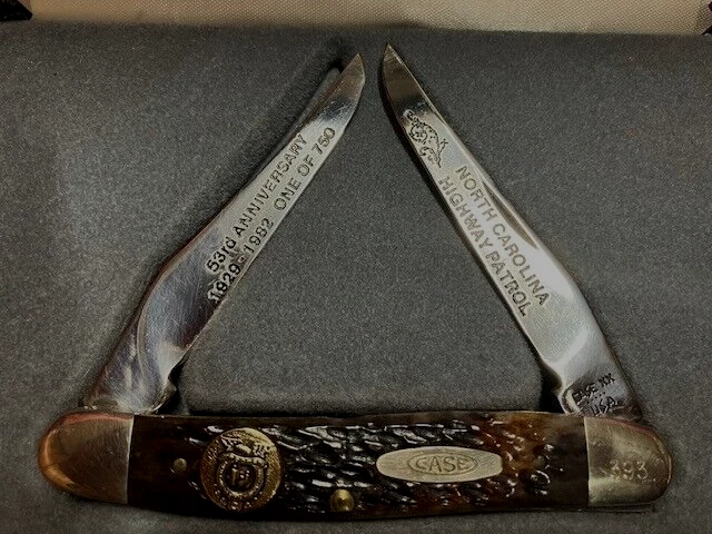 For sale is a very nice North Carolina Highway Patrol 53rd Anniversary Limited Edition pocket knife. The commemoration is for the years 1929 - 1982. This knife is one of 750 produced and is stamped #393. It comes in its original padded show case and is in very good condition. Blades have no rust and are tight in the handle. This is a very nice piece of memorabilia. Please review the photos to determine the condition for yourself prior to purchase. Thanks for looking.