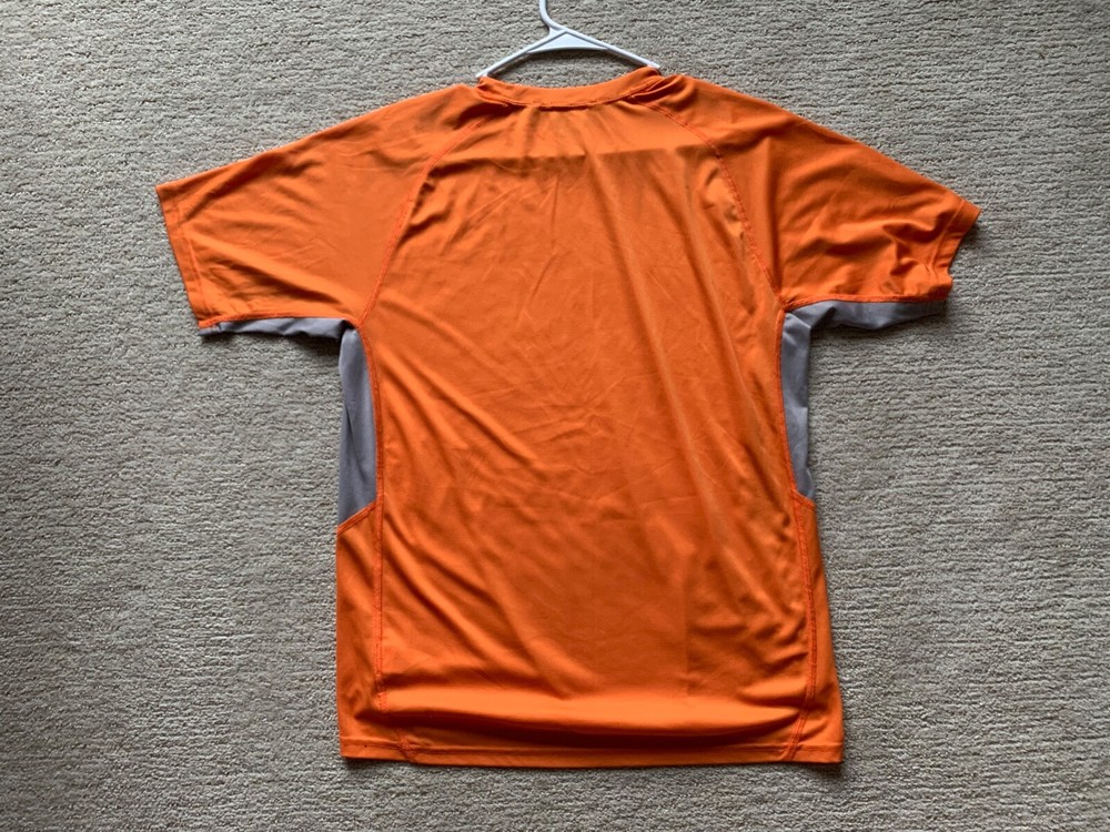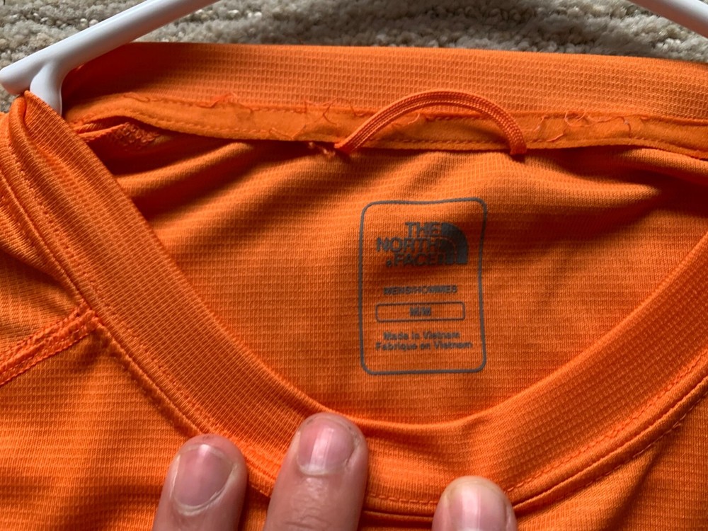 This is a men's North Face shirt in size Large, featuring a crew neckline and short raglan sleeves. It is made of lightweight and breathable microfiber polyester fabric, ideal for gym, walking, running, and other active pursuits. The orange shirt has a logo accent and is designed for outdoor and sports activities like cross training and jogging. Easy to care for with machine washable fabric. Notice small imperfections in pictures.