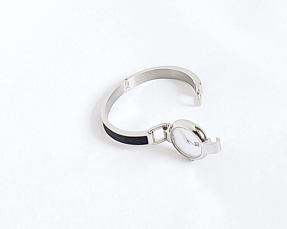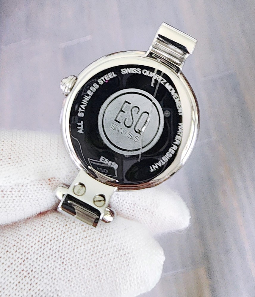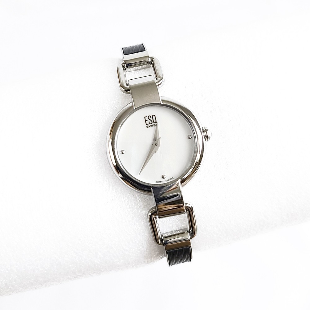 1 Details WATCH BRAND: ESQ Swiss (by Movado) COLLECTION: N/A MODEL NUMBER: 7101086 GENDER: Women MOVEMENT: Swiss Quartz RETAIL/MSRP: $225 DIAL COLOR: White Mother of Pearl SIZE: Diameter: 20 mm (0.79") HANDS/MARKERS: Silver Tone Stainless Steel, Polished Finish BRACELET BANDS: 6 mm (0.23") width; silver tone stainless steel, polish finished slim bangle adorned with black leather, features a hook closure to keep the watch secure and comfortable around the wrist. LUG WIDTH: 6 mm (0.23") CLASP: Hook closure; Adjust-O-Matic closure FITS WRIST: Up to 16 cm (6.25") CASE MATERIAL: Silver Tone Stainless Steel; Polished Finish SIZE: Diameter 25 mm (1") excluding crown THICKNESS: 6 mm (0.23") BEZEL: Silver Tone Stainless Steel, Polished Finish ADDITIONAL INFORMATION FEATURES: Sapphire Crystal FUNCTIONS: Hour, Minute WATER RESISTANCE: 30 meters/165 feet/3 ATM WARRANTY: 2 Year Factory International Warranty 100% brand new and authenticity guaranteed or your money back. Item comes with original ESQ Swiss presentation box, retail tag, instruction manual, and two year international warranty. Brand new with factory seals intact. All items are in stock ready to ship.