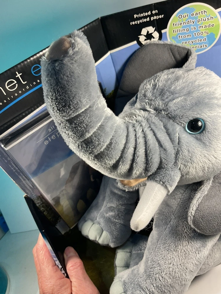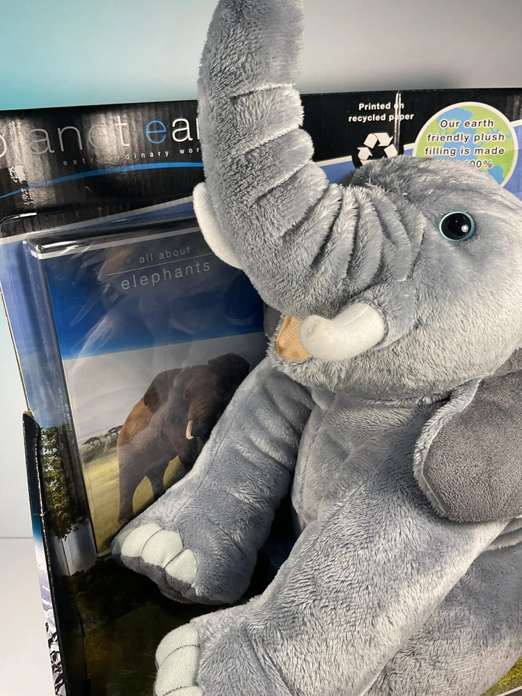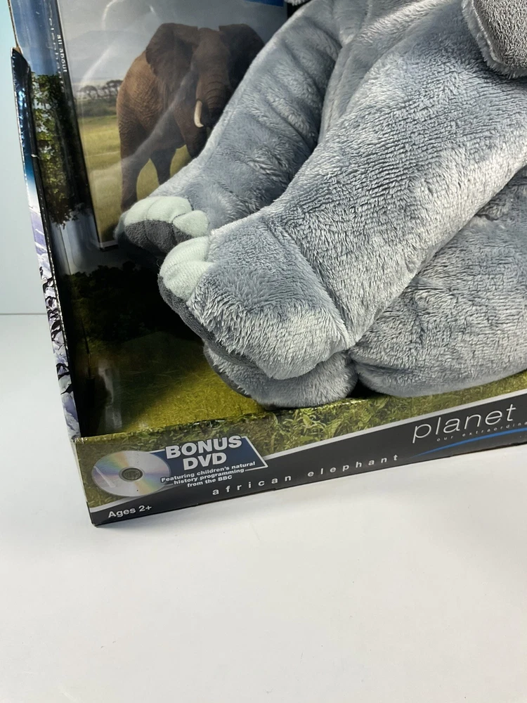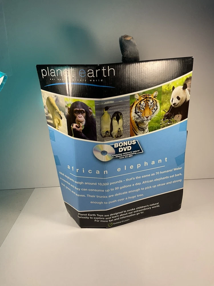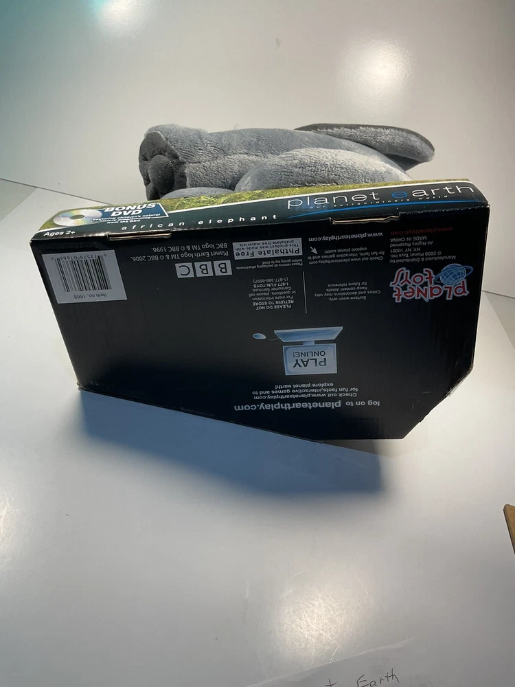 The product is a 14-inch plush elephant from the brand Planet Earth By Loveearth, released in 2008. It features a washable, gray-colored design with blue eyes, inspired by the BBC DVD series "Planet Earth." This elephant plush is suitable for children aged 3 and up and is part of the elephant character family. It comes with a setting that enhances its gift appeal, making it a special and meaningful present for any occasion. Made in China, this elephant plush is a charming addition to any toy collection. The is a New unused toy in original packaging and includes BBC DVD. Item will be packed quickly and shipped safely by USPS, or UPS ,depending on buyers location. THANKS