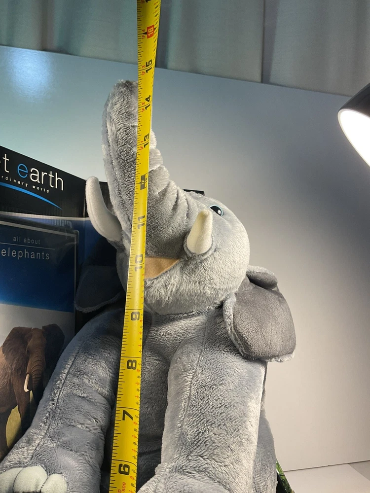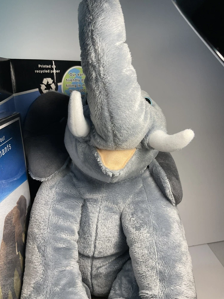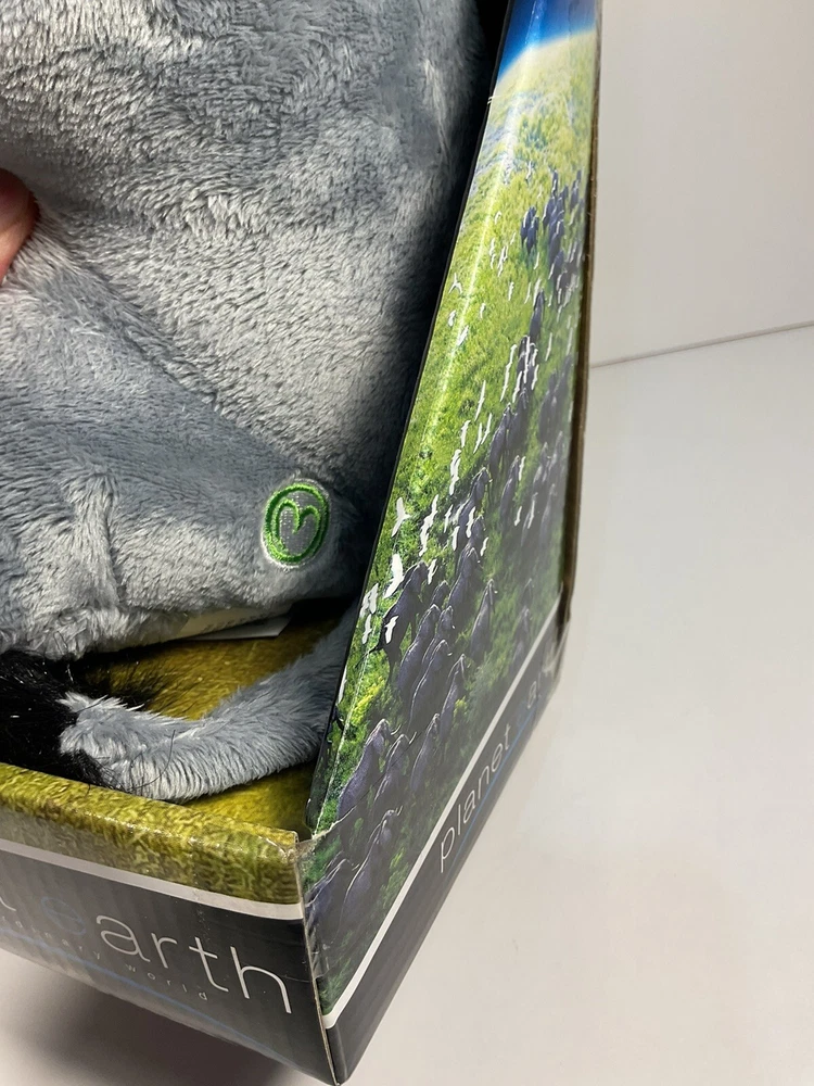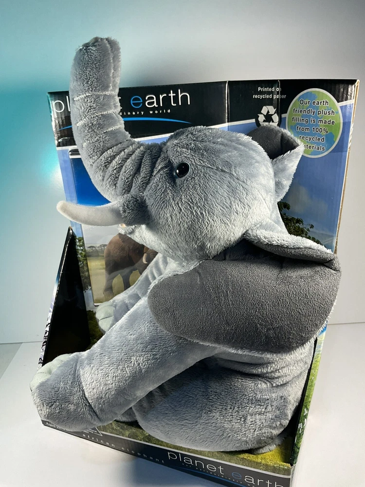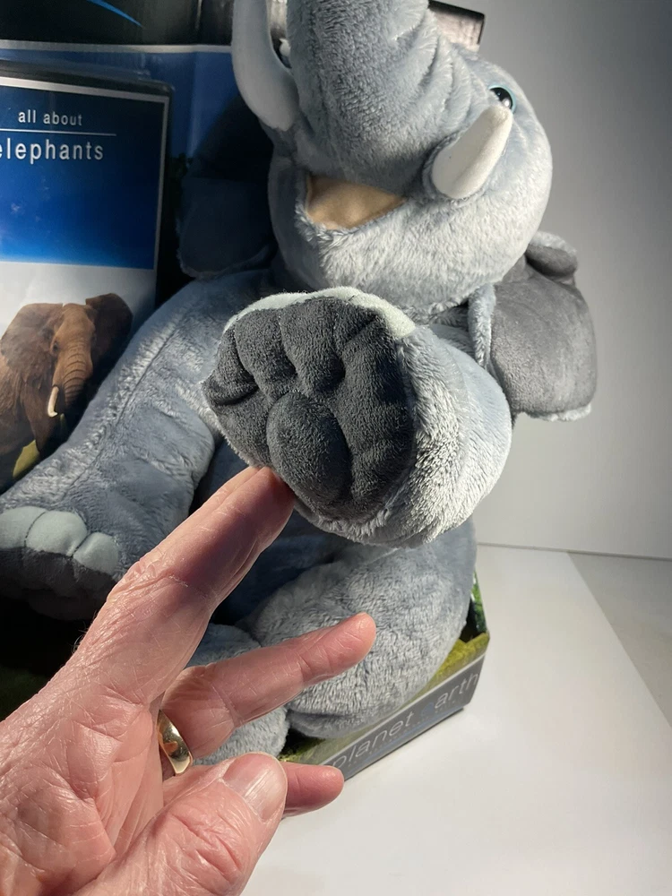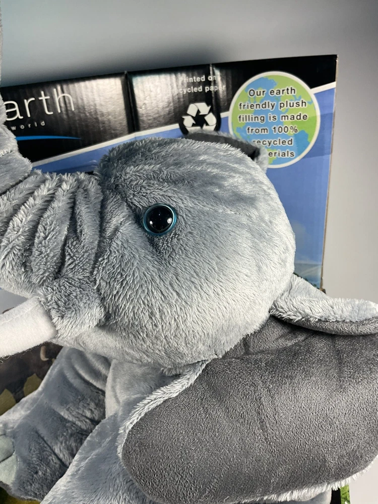 The product is a 14-inch plush elephant from the brand Planet Earth By Loveearth, released in 2008. It features a washable, gray-colored design with blue eyes, inspired by the BBC DVD series "Planet Earth." This elephant plush is suitable for children aged 3 and up and is part of the elephant character family. It comes with a setting that enhances its gift appeal, making it a special and meaningful present for any occasion. Made in China, this elephant plush is a charming addition to any toy collection. The is a New unused toy in original packaging and includes BBC DVD. Item will be packed quickly and shipped safely by USPS, or UPS ,depending on buyers location. THANKS