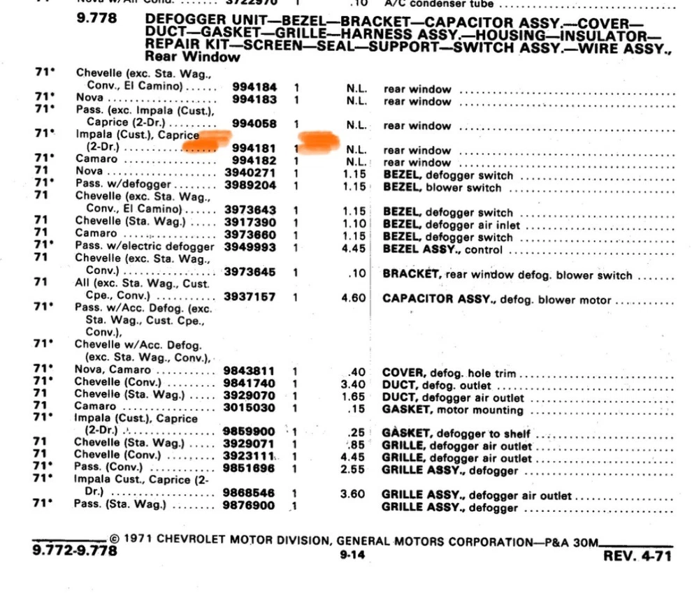 OE/OEM Part Number: 1971, 1972, 1973, 71, 72, 73 Manufacturer Part Number: 994331, 9.778, 9834050, 9836529, 9821162 Items Included: As Shown Type: Defroster Features: New Old Stock, Chevrolet, Passenger Manufacturer Warranty: None Vintage Part: Yes Brand: General Motors Color: Black Placement on Vehicle: Rear Superseded Part Number: 994181 Material: Plastic, Metal