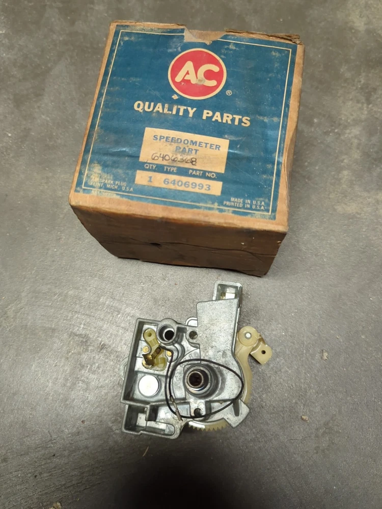 Original AC/GM speedometer frame in it's original box. The part consists of all of the internal workings -frame, gears etc. box is dated October of 62. The part number on the box is 6406993 the number on the part itself is 6406386. The complete speedometer part number would have been 6406386. My AC parts book says the type is "AF" -i'm not sure what 63 Buick models it will fit -maybe all, maybe not. Make sure to check pics or check the part number to make sure it works for your car before you buy