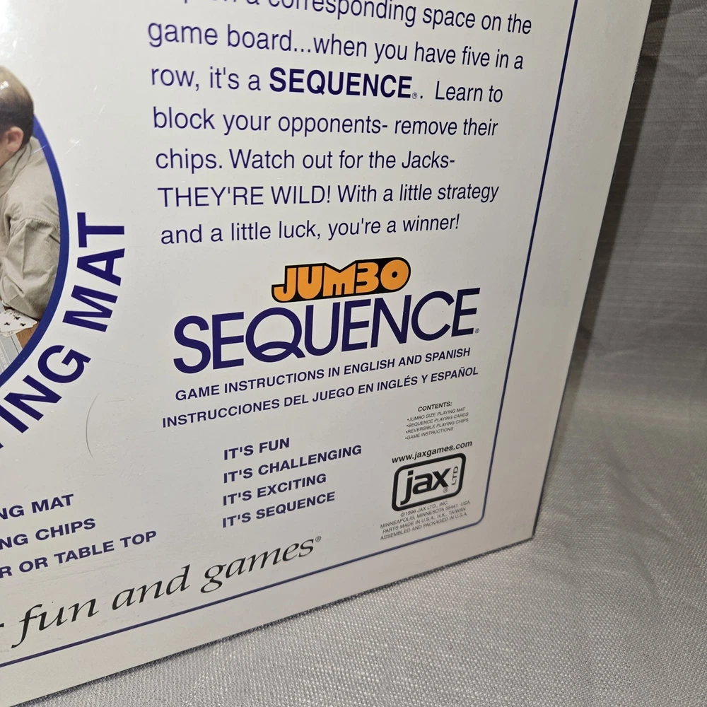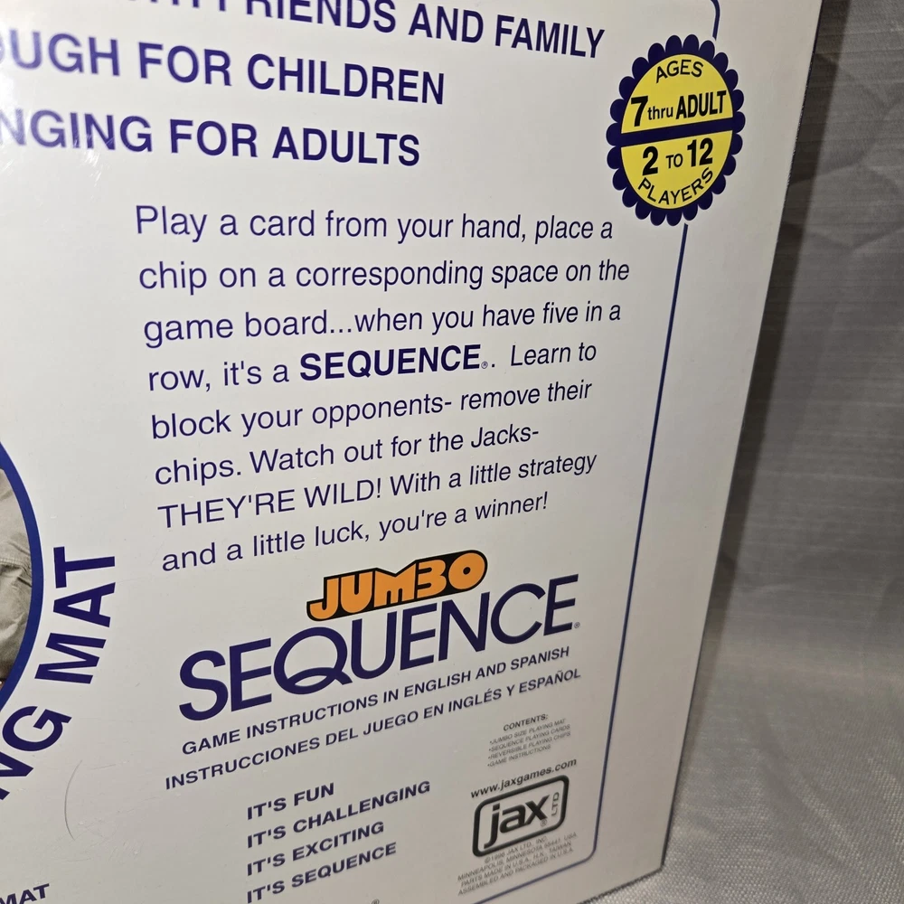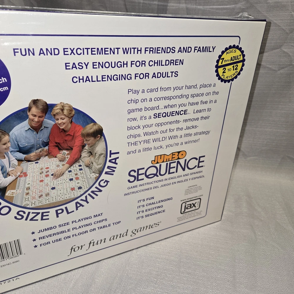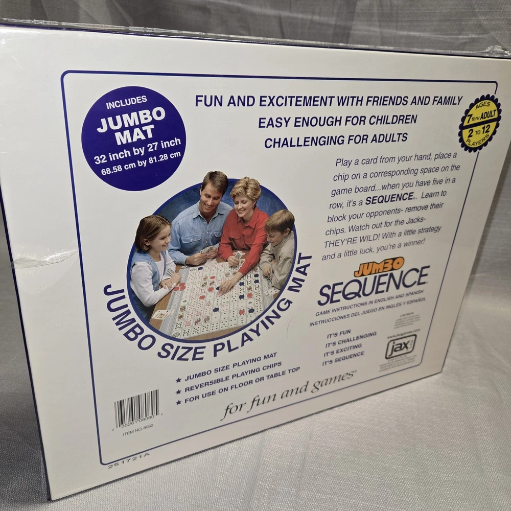 Game Title: Sequence JUMBO Theme: Strategy Year: 1996 UPC: 035261080805 Recommended Age Range: 7+ Brand: Jax gtin13: 035261080805