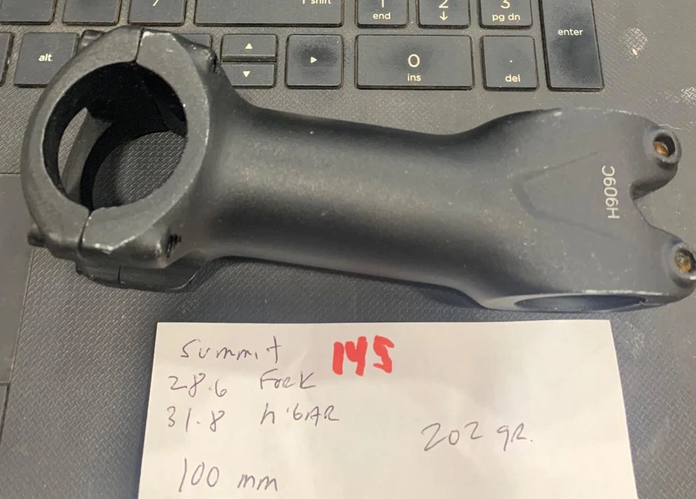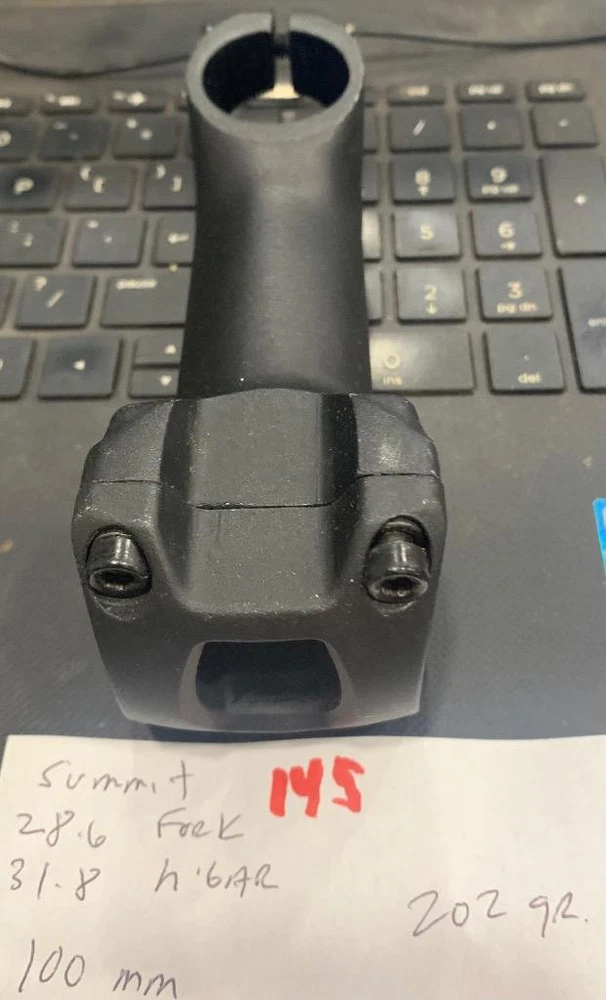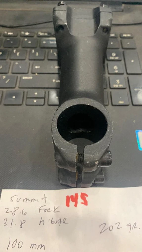 NOS Mountain Bike Black Summit Threadless Front Load Stem Gooseneck 5-degree rise, 100mm long, alloy with a 28.6 steering tube opening and bar opening of 31.8. NOS Mountain Bike Threadless Summit Stem 100mm 5 Degree 31.8 Steerer 28.6 #145 NOS Mountain Bike Threadless Summit Stem 100mm 5 Degree 31.8 Steerer 28.6 #145 Description You are buying a NOS Mountain Bike Black Summit Threadless Front Load Stem Gooseneck 5-degree rise, 100mm long, alloy with a 28.6 steering tube opening and bar opening of 31.8. Shipping will be $6.95 in the 50 states. I will ship overseas. Payment must be received before 7 days after purchase of item. Please ask all questions before buying. Add me to your Favorite Sellers View My Other Items For Sale Visit My eBay Store For Immediate Purchases And Shipping. Click images to enlarge Get images that make Supersized seem small. Showcase your items with Auctiva's Listing Templates! THE simple solution for eBay sellers. Track Page Views With Auctiva's Counter