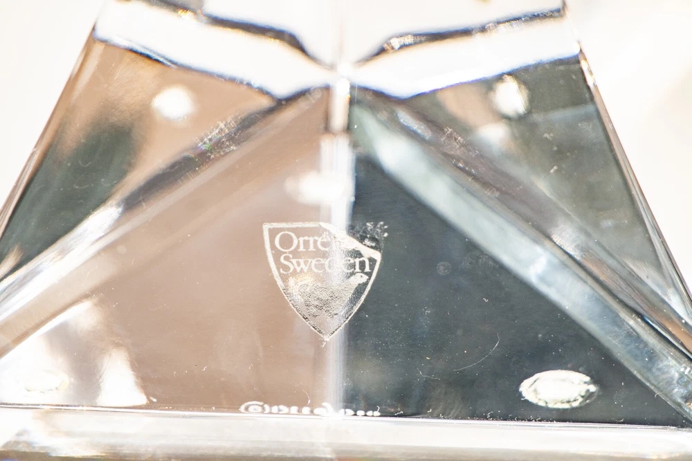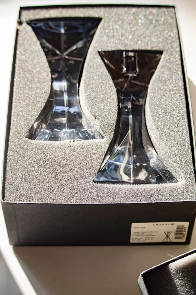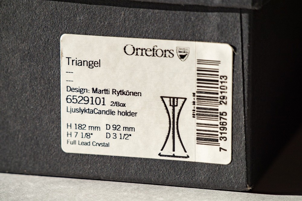 Orrefors Vintage Orrefors Triangel Full Lead Crystal Candle Holder SET With Original Box Made In Sweden Designer, Martti Rytkonen Height 182mm/ 7 1/8 ” Diameter 92mm/ 3 1/2 ” 6529101 Condition: Condition is New Old Stock in Original Box. No chips, cracks or repairs. Candle Sticks are Very Beautiful and in Excellent and Unused but Handled condition (to take photos). One of the two removable decal stickers has a slightly peeled corner (see photo). Box shows storage wear, including scratches and nicks. Please see all photos as they are part of the description. Pictures of actual item you will receive. 100% Authentic. Bright white spots are usually from lighting or camera flash. Item is from a non-smoking home here on the Monterey Bay. Please feel free to ask any related questions. Content: Only item (s) pictured, if it's not mentioned or pictured, its not included. Payment: 4 days with auction listings. Or immediate with Buy It Now. Returns: 30 days, buyer to pay return shipping cost. Shipping: USPS will be well packaged. Shipping cost reflects fully insured item. Please see shipping/payment tab for shipping cost to your location. Message for combined shipping on multiple items. Contact/Questions: Please feel free to contact us for any reason; prior to purchasing or placing bids is best. For questions relating to an auction item, please ask no later than 4-hours from auction end so we are able to address your questions in a timely manner. Thank you for checking out our additional listings! Thank you for your bidness!