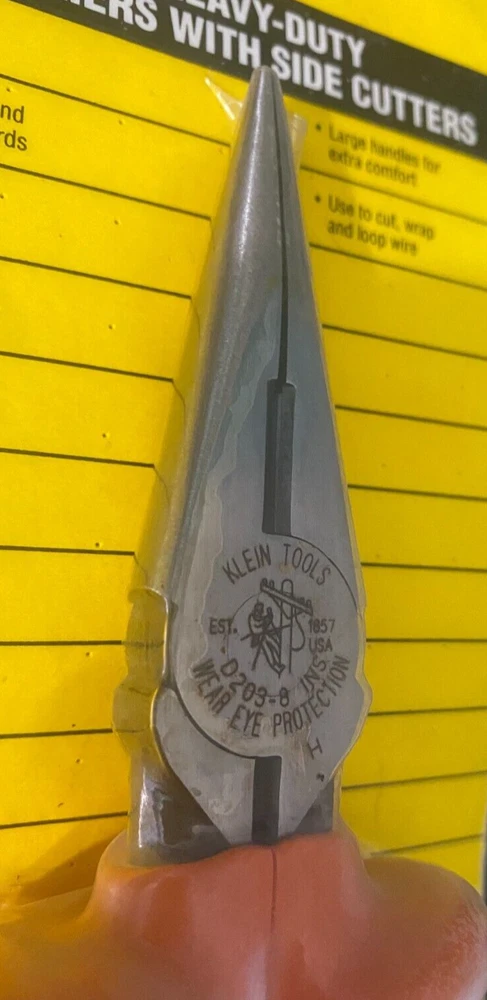 Brand: Klein Tools Country/Region of Manufacture: United States UPC: 092644710292 Number of Pieces: 1 Type: Side Cutting Pliers/Nippers Item Length: 8IN Color: Orange MPN: D203-8-INS Model: KLEIN TOOLS D203-8-INS gtin13: 092644710292 Material: Alloy Steel, 1000V insulated Features: Heavy-Duty, 1000V INSULATED, LONG-NOSE, F 1505-94, HIGH QUALITY Size: 8 in