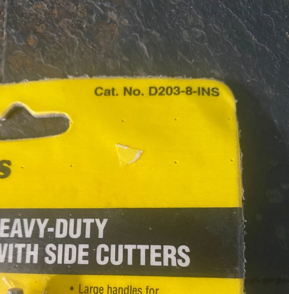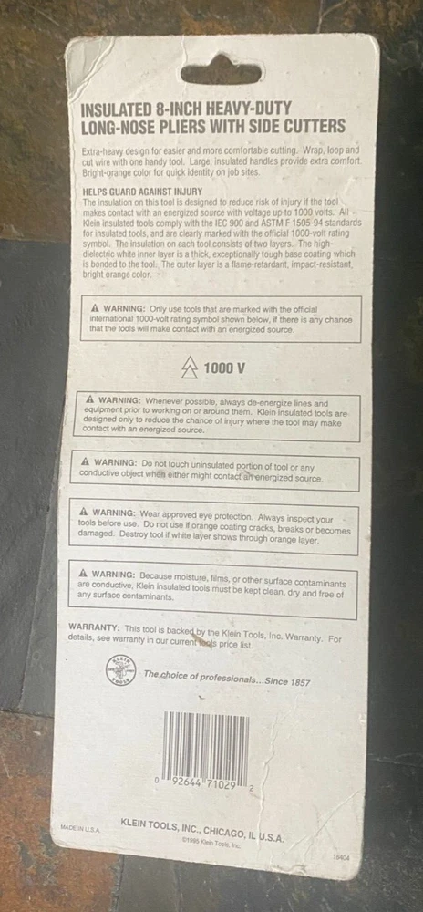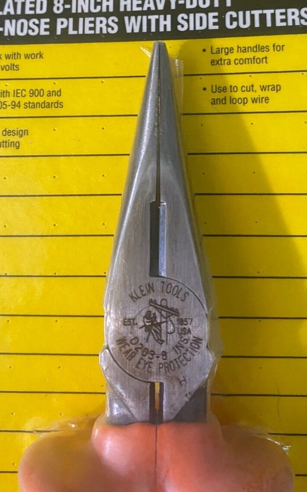 KLEIN TOOLS 8-IN 1000V INSULATED HEAVY-DUTY LONG-NOSE PLIERS WITH SIDE CUTTERS RARE, NEW OLD VINTAGE STOCK QTY:( X1) MODEL: D203-8-INS AGE: COPYRIGHT DATE 1995 (Stamped "H") MADE IN USA HIGH QUALITY REDUCE RISK WITH WORK UP TO 1000V COMPLIES WITH IEC 900 AND ASTM F 1505-94 STANDARDS EXTRA-HEAVY DESIGN FOR EASIER CUTTING LARGE HANDLES FOR EXTRA COMFORT USE TO CUT, WRAP, AND LOOP WIRE Condition: New Vintage Old Stock: I've been storing these since I closed my tool store in 2005. Some bends on the cardboard packaging. and wear along the packaging edges. The pliers are in new condition. I don't see any signs of rust. Shipping Costs: Since most of my tools are vintage. I ship them in boxes with really good packing. If you need a better shipping rate, I might be able to package your item(s) in a padded envelope instead which should cost much less, but it will not be as protected. If you need me to ship in an envelope instead please reach out and I will revise my listing so you can save $$ on shipping. Product Condition: The tools I am selling are all surplus new old stock that has been moved around a lot over the years since I owned my tool store. Some of the items were taken out of the box for photos. The original boxes and packaging might be in rough condition. Some tools might have some wear, scuffs, scrapes, and minor surface rust spots. The photos are of the item(s) the winner will receive, and no additional item(s) not pictured in the photos are available to include in the auction. Please review all of the photos and descriptions carefully. T erms of Sale: Please read these terms and conditions carefully. Refunds & Concerns: My listings show that I do not accept refunds. Please contact me immediately if you have concerns about your product or need a refund. My customers are important to me, and I care about them and my feedback score. There is very little that can't be resolved by a quick message to me versus writing a negative review. Please allow me the opportunity to resolve any concerns you might have. Payments: All auctions are prepaid only. I accept Pay online payments through PayPal. I accept credit/debit card payments via PayPal. I do not accept personal/business checks, wire transfers, or ACH payments. Sales Tax: The customer is responsible for payment of all applicable state and local sales taxes. All Idaho residents, please add 6.0% sales tax. C ustomers who want to claim tax exemption must send a tax-exempt form to eBay. eBay collects all sales tax; I have no control. To send your tax-exempt form to eBay, copy and paste the following link into your browser: https://www.ebay.com/help/buying/paying-items/paying-tax-ebay-purchases?id=4771#section2 Shipping Terms: Items will ship within 1-3 business days (excluding holidays). Any listings that I offer free shipping are only applicable to the US lower 48 states. Please enter your zip code (or country) and quantity in the shipping tab for an accurate quote. Need it urgently? Next-day and Second-Day Air Services are available. Message me, and I will do my best to get it to you quickly. I ship USPS, UPS & FedEx. I choose the carrier. The shipping price listed is the price to ship this item to a residence or a business. If you are a multiple auction winner, I will happily combine shipping. If you have multiple winning auctions, please message me before making payments so I can properly invoice you for shipping. I am generally available 9 am-5 pm Pacific Standard Time Monday through Friday to answer questions. International buyers are responsible for customs fees and duties on items shipped internationally by local laws and regulations. Whether these fees are due at the time of the purchase or on delivery of the item is determined by the shipping method that I (the seller) offer or that the buyer chooses at the time of purchase and the local laws and regulations. Product Compliance and Suitability: Jurisdictions have varying laws, codes, and regulations governing the construction, installation, and/or use of products for a particular purpose. Certain products may not be available for sale in all areas. The seller does not guarantee compliance or suitability of the products it sells with any laws, codes, or regulations, nor does the seller accept responsibility for the construction, installation, and use of a product. The Customer is responsible for reviewing the product application and all applicable laws, codes, and regulations for each relevant jurisdiction to ensure that the products' construction, installation, and/or use are compliant. Seller makes no representations as to the quality, condition, danger, adequacy of warning labels, adequacy of installation or operating manuals, performance, safe operation of, or latent or unknown defects respecting the goods; and Buyer assumes the entire risk as to all of same upon Buyer taking possession of the goods. Seller also states, and Buyer acknowledges, that the goods may bear or contain hazardous chemicals or materials which may be indirectly or directly hazardous to life, health, or property; Buyer assumes the entire risk as to all of same upon Buyer taking possession of the item