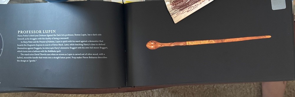 The Wizarding World Wand - Remus Lupin is an item inspired by the character Remus Lupin from the Harry Potter franchise. This fantasy-themed wand is a must-have for fans of the series, allowing them to channel their inner wizard and immerse themselves in the magical world created by J.K. Rowling. Perfect for adding a touch of enchantment to any desk or shelf, this wand is a unique and whimsical addition to any fan's collection. There is a slight nick in the handle.