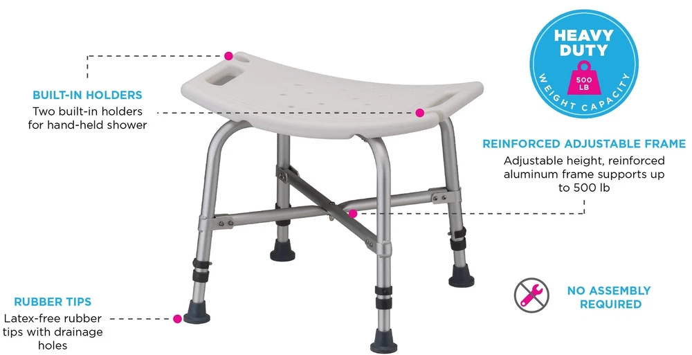 NOVA Medical Products Heavy Duty Shower Bath Chair 500 lb. Weight Capacity Quick Easy Tools Free Assembly Lightweight Seat Height Adjustable Great for Travel, White, 1 Count Heavy duty 500 lb. Weight capacity shower and bath chair has a reinforced frame for strength and durability. Shower chair also available with back (NOVA heavy duty shower chair with back 9023) Shower or bathe in comfort and safety on a bath chair with dual sided handles and hand held shower holders. Assembles in minutes – Tools free assembly. Push button - snap together design requires No tools and assembles and un-assembles in just minutes. Great for storage or travel. Durable & lightweight design is made of blow molded plastic and rust proof aluminum. Skid resistant rubber tips have a wide base and drainage holes. Specifications: weight capacity: 500 lbs., seat dimensions: 20"W x 12"D; seat height adjustment: 17"-23", footprint on lowest adjustment - 18.5"W x 16.75"D, footprint on highest adjustment – 19.75"W x 18"D; overall dimensions on lowest adjustment - 20"W x 16.75"D, overall dimensions on highest adjustment - 20"W x 18"D, product weight: 5 lbs. 9013 features: -heavy duty blow molded seat. -Aluminum anodized frame. -Weight capacity: 500 lbs. -Bathroom 365 collection. Product type: -shower Chair. Weight capacity: -500 pounds. Adjustable: -Yes. Corrosion resistant: -Yes. Dimensions: -seat depth: 12". Overall Width - side to side: -20". Overall depth - Front to back: -18.25". Overall product weight: -5 lbs. Overall Height - Top to bottom: -15.5". Overall Height - Top to bottom: -21". Shipping We offer FREE shipping on all orders! We use a selection of shipping services such as UPS, FedEx, USPS etc. We only ship to the lower 48 states, no APO/FPO addresses or PO Boxes allowed. Local pickups and combined shipping options are not provided at this time. Return You can return a product for up to 30 days from the date you purchased it. Any product you return must be in the same condition you received it and in the original packaging. Please keep the receipt. Payment We accept payment by any of the following methods: PayPal Please pay as soon as possible after winning an auction, as that will allow us to post your item to you sooner! Feedback Customer satisfaction is very important to us. If you have any problem with your order, please contact us and we will do our best to make you satisfied. Contact Us If you have any queries, please contact us via ebay. We usually respond within 24 hours on weekdays. Please visit our eBay store to check out other items for sale! Thank you for shopping at our store.