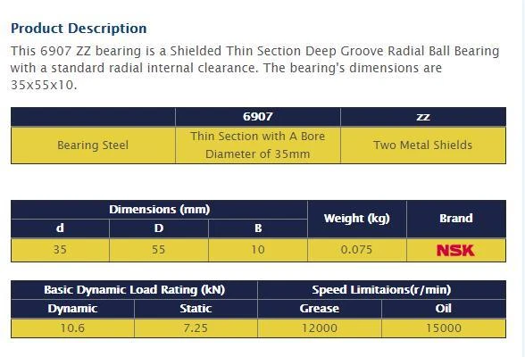Description 6906 ZZ CM NSK •Type : Ball •Bearing Style : Double Shielded, Open Type, Rubber Seal Type, Single Shielded •Load Direction : Radial For complete product overview and details on Deep Groove Ball Bearing - Standard, Single Row (NSK) see the sections below: Product Information Brand: NSK SKU: 6906zz-nsk Availability:In Stock Weight: 0.0520 KGS Technical Data Inside Diameter (mm): 30mm Outside Diameter (mm): 47mm Width (mm): 9mm Cage Type: Steel Seals or Shields: Two Metal Shields Clearance: Standard Dynamic Load Rating (kN): 7.25 Static Load Rating (kN): 5 Grease Limiting Speed (r/min): 14000 Oil Limiting Speed (r/min): 17000 Package Includes: ONE (01) BEARING 6906 ZZ NSK On Dec 12, 2024 at 23:32:33 PST, seller added the following information: