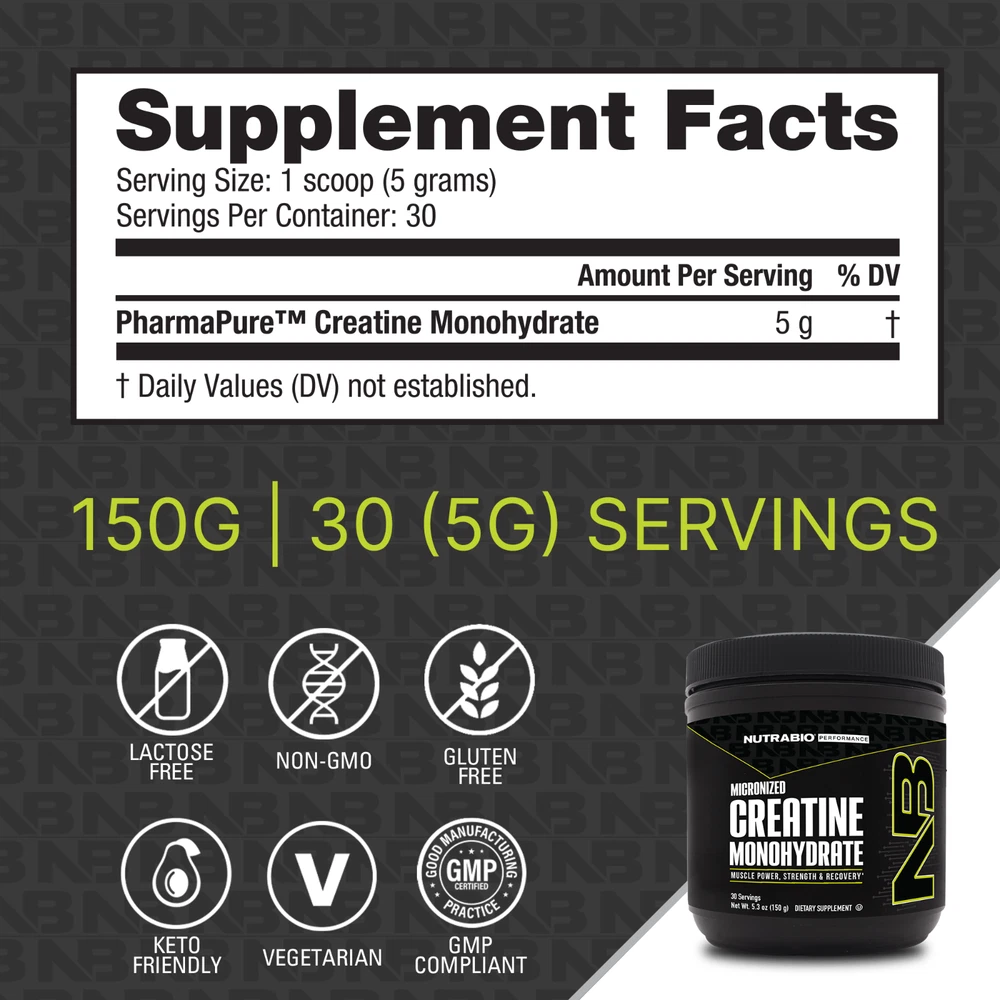The purest Creatine Monohydrate Available! Since 1996, NutraBio has sold only the purest supplements. Every batch is tested to be at least 99.98% pure or we won't ship it to you, that's our quality commitment. We manufacture here in the United States to meet FDA 21 CFR Part 111 CGMP regulations and all ingredients undergo state-of-the-art analysis to insure zero tolerance for impurities. We ship our products direct to you which guarantees the freshness. What is Creatine Monohydrate? Creatine is a precursor to the bio-energetic fuel creatine phosphate, which replenishes cellular ATP (adenosine triphosphate) levels during maximum intensity contractions. Supplementing with creatine can increase levels of creatine phosphate in the muscle improving work output capacity, power, recovery and muscle hydration. When muscles are hydrated, muscle catabolism (breakdown) is minimized. Creatine Boosts Muscle Strength, Size, and Endurance: Creatine is one of the most researched and important sports supplements today. It has become a must for athletes wanting to increase workout intensity while delaying the onset of fatigue. Research has shown that supplementing with creatine can boost muscle size, strength and endurance, improve athletic performance, and speed muscle recovery. Saturating your muscles with creatine improves your body's ability to quickly replenish and recycle ATP, which increases muscle energy and delays muscle fatigue. Studies show that when athletes supplement with creatine while weight training, they can quickly gain lean body mass and strength. Creatine may Act as a Lactic Acid Buffer Improve Exercise Recovery Time: Lactic acid is a bi-product from anaerobic (without oxygen) exercise, such as weight training. Lactic acid is responsible for the 'burning' sensation when the muscle becomes fatigued. When you cannot train anymore, it is due to you either having run out of energy or a buildup of lactic acid. Creatine may act as a buffer for this lactic acid, which helps to delay the onset of fatigue. Creatine Stimulates Protein Synthesis: It has been demonstrated that creatine may also promote muscle growth by stimulating protein synthesis in two ways. Firstly, from the increased work you are able to do as a result of its energy replenishing actions. Secondly is that the more creatine phosphate (CP) that is stored in muscle, the more water is drawn into muscle making it fuller and stronger. With more CP and water in muscle, the volume increases, and the muscle cell is volumized or 'super-hydrated'. A volumized muscle helps to trigger protein synthesis, minimize protein breakdown and increase glycogen synthesis (Haussinger 1996; 1996). If a muscle is then trained properly, this could lead to enhanced muscle growth. The muscle 'pump' experienced when using creatine is reported to be much more intense, and this is as a result of the cell volumizing effect.