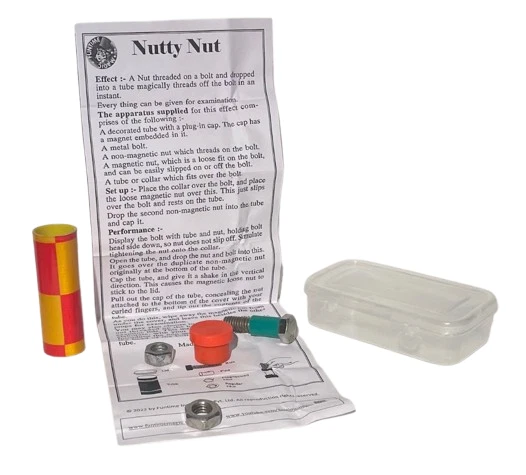 New Nutty Nut! A metal nut is threaded on a metal bolt with a collar and dropped into a 2.5" tube. A shake of the tube, and the contents of the tube are tipped to show the nut has magically threaded right off the bolt. Everything can be immediately handed out for thorough examination. This model is very well made, and comes to you at an amazingly low price, making it an excellent value. Complete with illustrated instructions. A great trick to demonstrate to some real nuts! A perfect pocket trick! A real fooler and easy to perform! Includes nut, bolt and plastic tube/cap. WOW FREE SHIPPING! NOW ON SALE! BEST PRICE ON EBAY or anywhere else! Robb. - G - 1