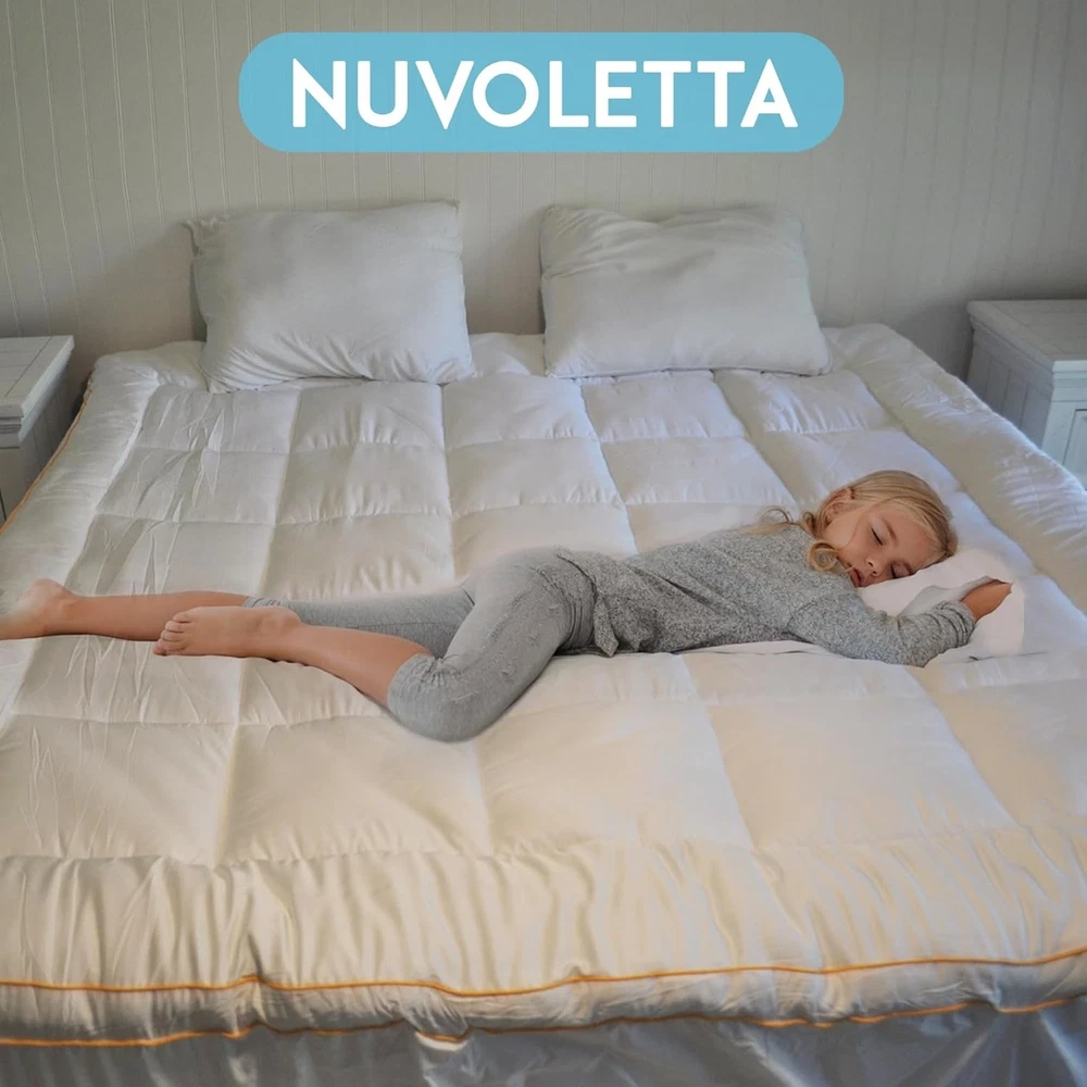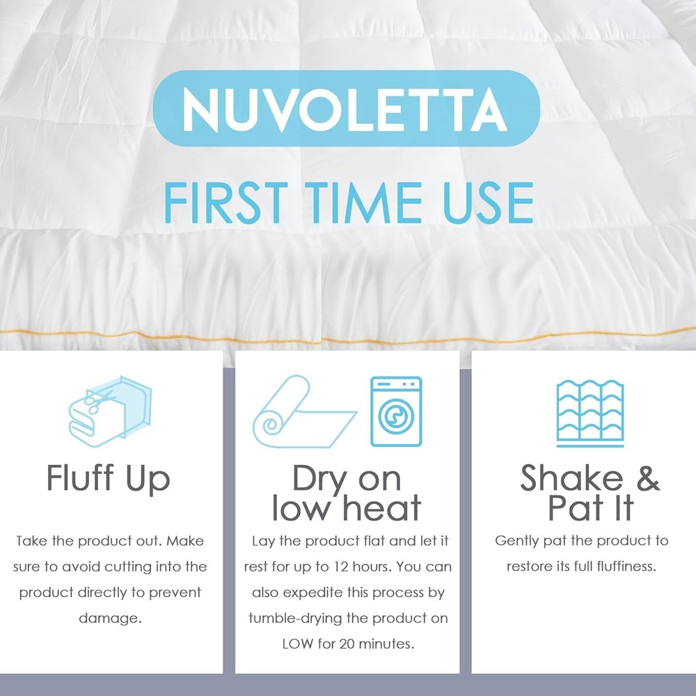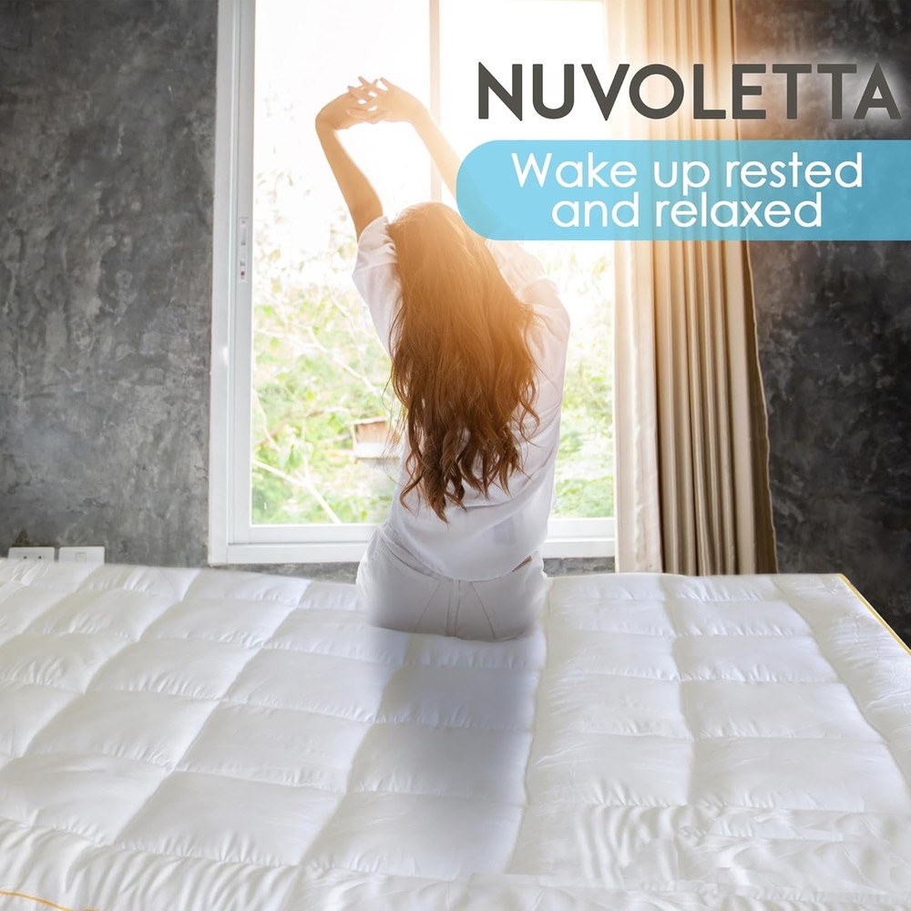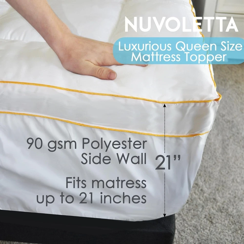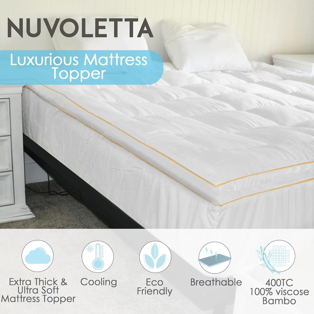 NUVOLETA Queen Mattress Topper, 100% Viscose Bamboo Cooling Queen, White Product Details Brand: NUVOLETTA Color: White Size: Queen Fabric Type: 100% Viscose Bamboo Special Feature: Pillow Top Closure Type: Pull On Product Care Instructions: Dry Clean Only Water Resistance Level: Not Water Resistant Age Range (Description): Child Manufacturer: Summit Jump Product Dimensions: 22 x 16 x 7 inches Item Weight: 13.07 pounds Country of Origin: China Cooling Technology - Stay cool and comfortable all night with our advanced cooling technology. The breathable bamboo fabric wicks away moisture, ensuring a refreshing and sweat-free sleep experience. Extra Thick Padding - Our mattress topper features an extra-thick design for added cushioning and support. Ideal for back pain relief, it helps alleviate pressure points and enhance sleep quality. Hypoallergenic Material - Made from premium hypoallergenic materials, our topper is perfect for those with allergies. It provides a clean and healthy sleep environment, free from allergens and irritants. Secure Fit - The deep-pocket design ensures a secure fit on your king-size mattress. It stays in place throughout the night, providing consistent comfort without shifting or bunching. SLEEP ON CLOUD LIKE COMFORT - Experience unparalleled softness with our Luxury Cooling Down Alternative Mattress Topper. Designed to provide plush support, it transforms your king size bed into a cozy haven. Introducing the NUVOLETTA Luxury Cooling Down Alternative Mattress Topper, the ultimate solution for transforming your king size bed into a haven of comfort and luxury. This king mattress topper is meticulously crafted to provide an unparalleled sleeping experience, combining the plushness of a pillow top with advanced cooling technology to ensure you rest in blissful serenity every night. Designed for those who crave the perfect balance of softness and support, our king size pillow top mattress topper is generously filled with premium down alternative fibers. This extra thick mattress topper king size offers a cloud-like feel, enveloping you in sumptuous comfort while alleviating pressure points, making it ideal for back pain relief. The cooling mattress topper king size is engineered with breathable materials that regulate temperature, ensuring you stay cool and comfortable throughout the night. The NUVOLETTA Luxury Cooling Down Alternative Mattress Topper is not just about comfort; it's also about convenience and durability. The king mattress pad topper is easy to install and stays securely in place, thanks to its deep pockets and elasticized edges. This king bed topper is also hypoallergenic, making it perfect for those with allergies or sensitive skin. Plus, its machine-washable design ensures effortless maintenance, so your bed topper king remains fresh and clean. Elevate your sleeping experience with the NUVOLETTA Luxury Cooling Down Alternative Mattress Topper. Whether you're looking for a king size bed topper, a plush mattress topper king, or a cooling mattress topper king, this versatile product meets all your needs. Invest in your sleep quality and indulge in the luxurious comfort that only NUVOLETTA can provide.