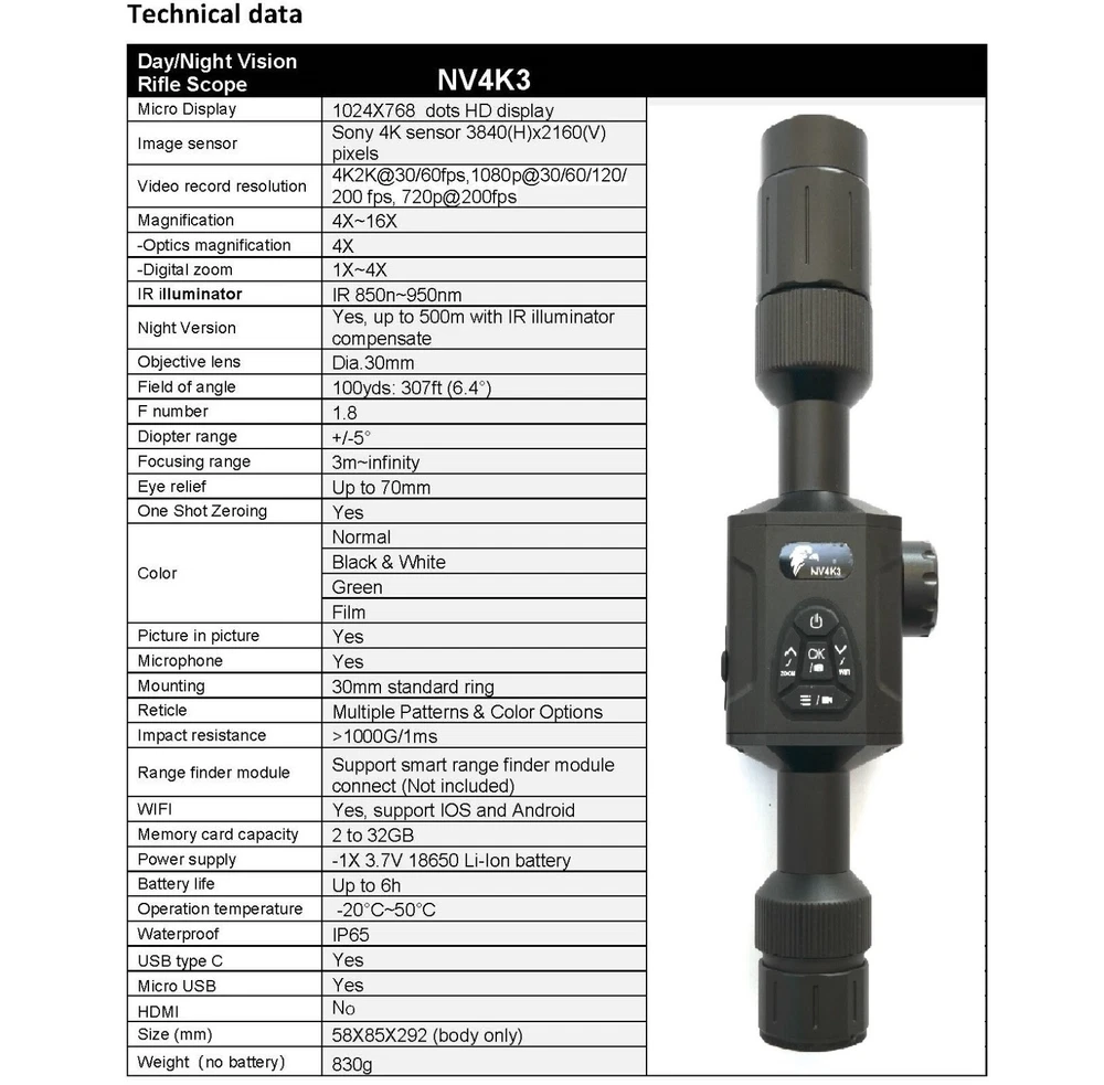 4K resolution and 1024X768 high resolution OLED display 1: All housing material are aluminum and lenses material are glass, not plastic material. So strong enough to support impact resistance > 1000G/1ms. 2: Built-in WIFI allows real-time video streaming at your smartphone (default Wi-Fi Password: 12345678), Connect with Smartphone using Roadcam App,support IOS and Android. 3: 1024X768 dots high resolution 0.39'' OLED display. 4: Night vision distance up to 500m, thanks to the ultra low-light CMOS with external 850nm Infrared illuminator 5: High quality Japanese CMOS sensor with photo resolution at 3840X2160 pixels, record video at full HD resolution at 4k 6: 4X~ 16X magnification. 7: Compatible to common mounts and fixtures, can also be used with standard 21mm and 11mm rails 8: Eye relief up to 60mm 9: To adjust position of reticle (both day & night mode), simply tap the menu button and enter the "Reticle" > "Reticle adjustment" menu. Then you can adjust the crosshairs in both X and Y directions. 10: 18650 Lithium battery is not included due to shipping regulations See the future in high definition with thenew 4K infrared night vision scope. Hunt with an advanced 4K sensor, providing full-color clarity in daytime – with classic emerald or black and white viewing options, more clearly than 1080p digital scope, It has a 1024X768 dots high resolution OLED 0.39" display, more clearly and color fresh. It has classic shape and small size shape. Classic shape with 30mm rings to fix and a removable 850nm or 940nm IR Illuminator. All material are Aluminum and glass, impact resistance more than 1000G,