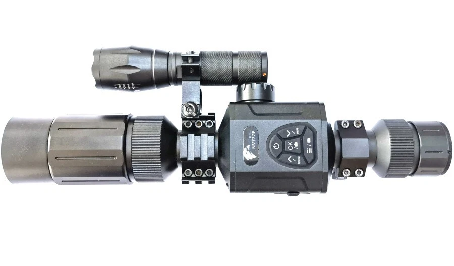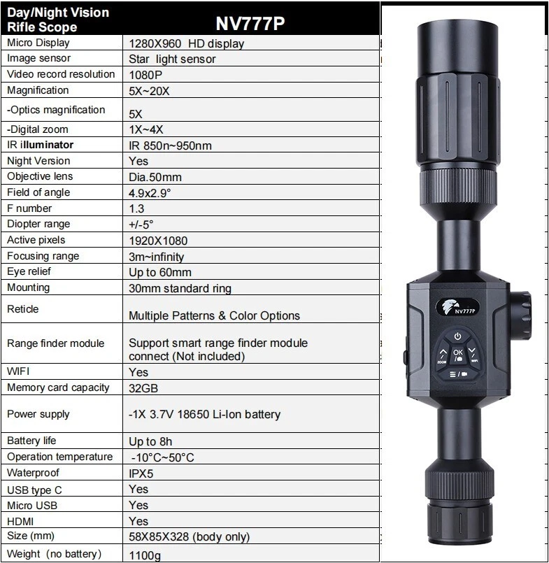 1080p video and 1280x960 dots 0.39'' high resolution display Professional hunting scope, infrared night vision scope, good result in day and night. 1: All housing material are aluminum and lenses material are glass, not plastic material. So strong enough to support impact resistance > 1000G/1ms. 2: Built-in WIFI allows real-time video streaming at your smartphone (default Wi-Fi Password: 12345678), Connect with Smartphone using Roadcam App,support IOS and Android. 3: 1280X960 dots high resolution 0.39'' display, made in Japan. 4: Night vision distance up to 500m, thanks to the ultra low-light CMOS with external 850nm Infrared illuminator 5: High quality Japanese CMOS sensor with photo resolution at 3072X1728 pixels, record video at full HD resolution at 1080P. 6: 5X~ 20X magnification. 7: Compatible to common mounts and fixtures, can also be used with standard 21mm. 8: Eye relief up to 60mm 9: To adjust position of reticle (both day & night mode), simply tap the menu button and enter the "Reticle" > "Reticle adjustment" menu. Then you can adjust the crosshairs in both X and Y directions 10: 18650 Lithium battery is not included due to shipping regulations Hap Hawk scope 1080P digital scope has Sony 1080p CMOS sensor and high resolution 1280x960 dots 0.39" display made in Japan, providing full-color clarity in daytime – with classic emerald or black and white viewing options. It has classic shape and small size shape. Classic shape with 30mm rings to fix and a removable 850nm or 940nm IR Illuminator. All material are Aluminum and glass, impact resistance more than 1000G, 9800J. One shot zeroing Aim at the target, shot, if the bullet hole is not at the center of target, then adjust reticle, make sure the yellow reticle is at the center of target, then adjust the red reticle to the bullet hole, click OK. 360m away