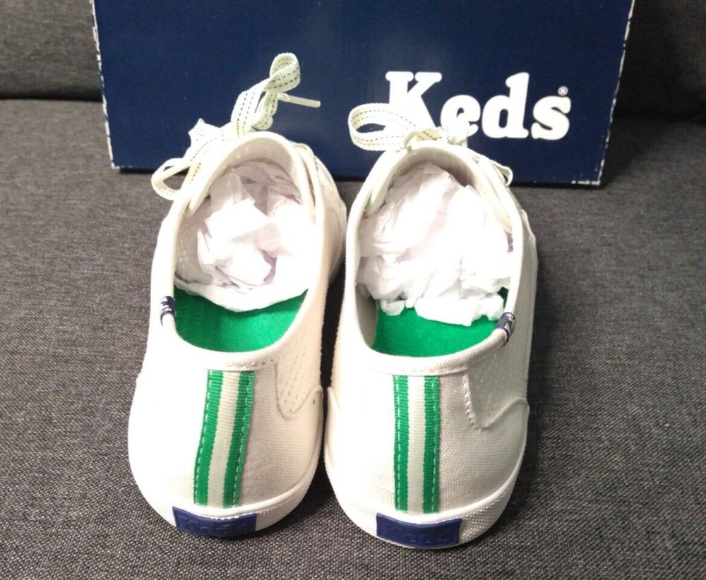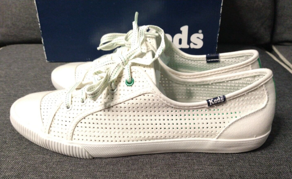 The product is a pair of Keds Celeb Perforated sneakers for women in size 8, featuring an off-white ivory color and lace-up closure. The shoes are made of canvas fabric and are designed with a casual athletic style. They are new in the box and are suitable for everyday wear. The box has a lot of scuffs. The box has scuffs and scrapes, but the shoes are in new condition.