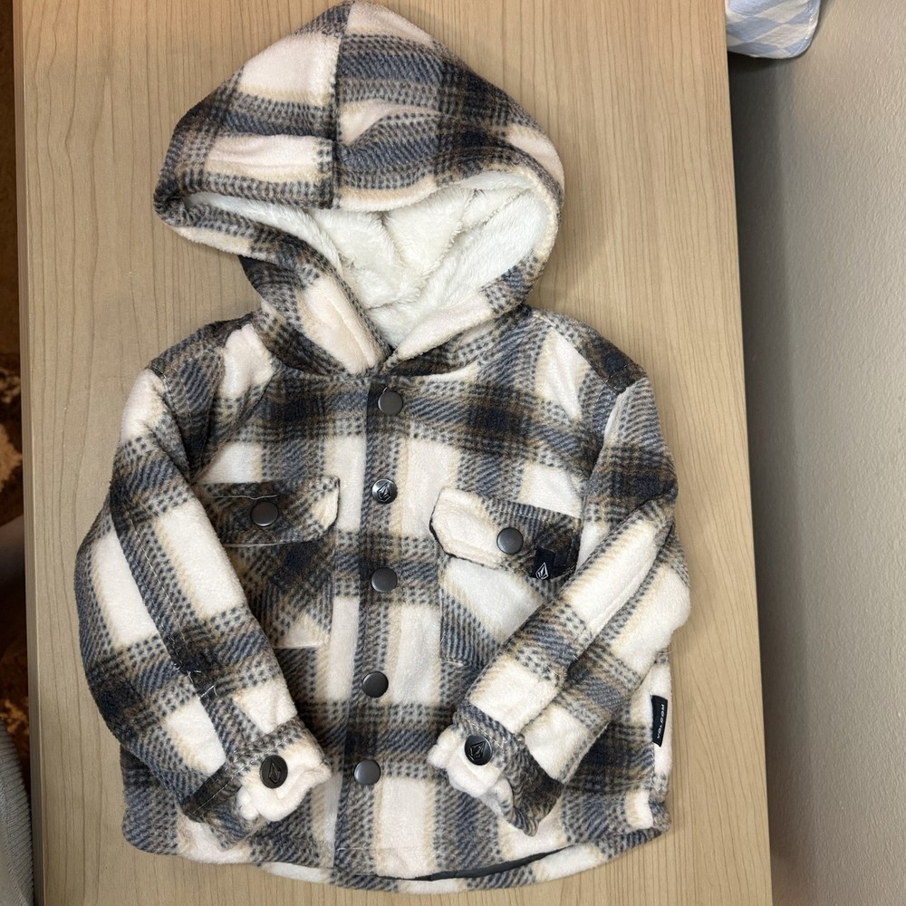 The NWOT 3 Piece Volcom Boys Coat, Shirt, and Pants in size 9-12 months is a stylish and versatile outfit set designed for young boys. This plaid ensemble features a colorful design with tan, black, and white tones. The set includes a button-up shirt, hooded vest, and matching pants, making it perfect for travel, parties, or casual wear. Made from blended fabric and machine washable, this outfit is comfortable, stretchy, and easy to care for. With a classic and colorful theme, this set is a great choice for the summer, fall, and spring seasons.