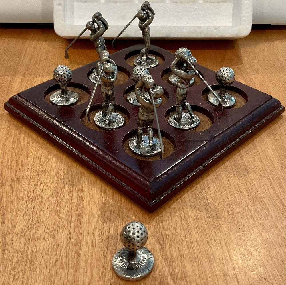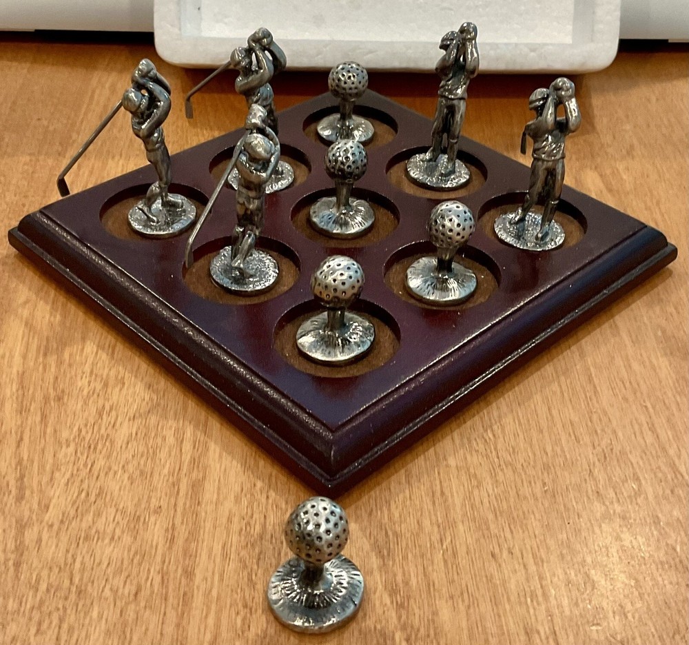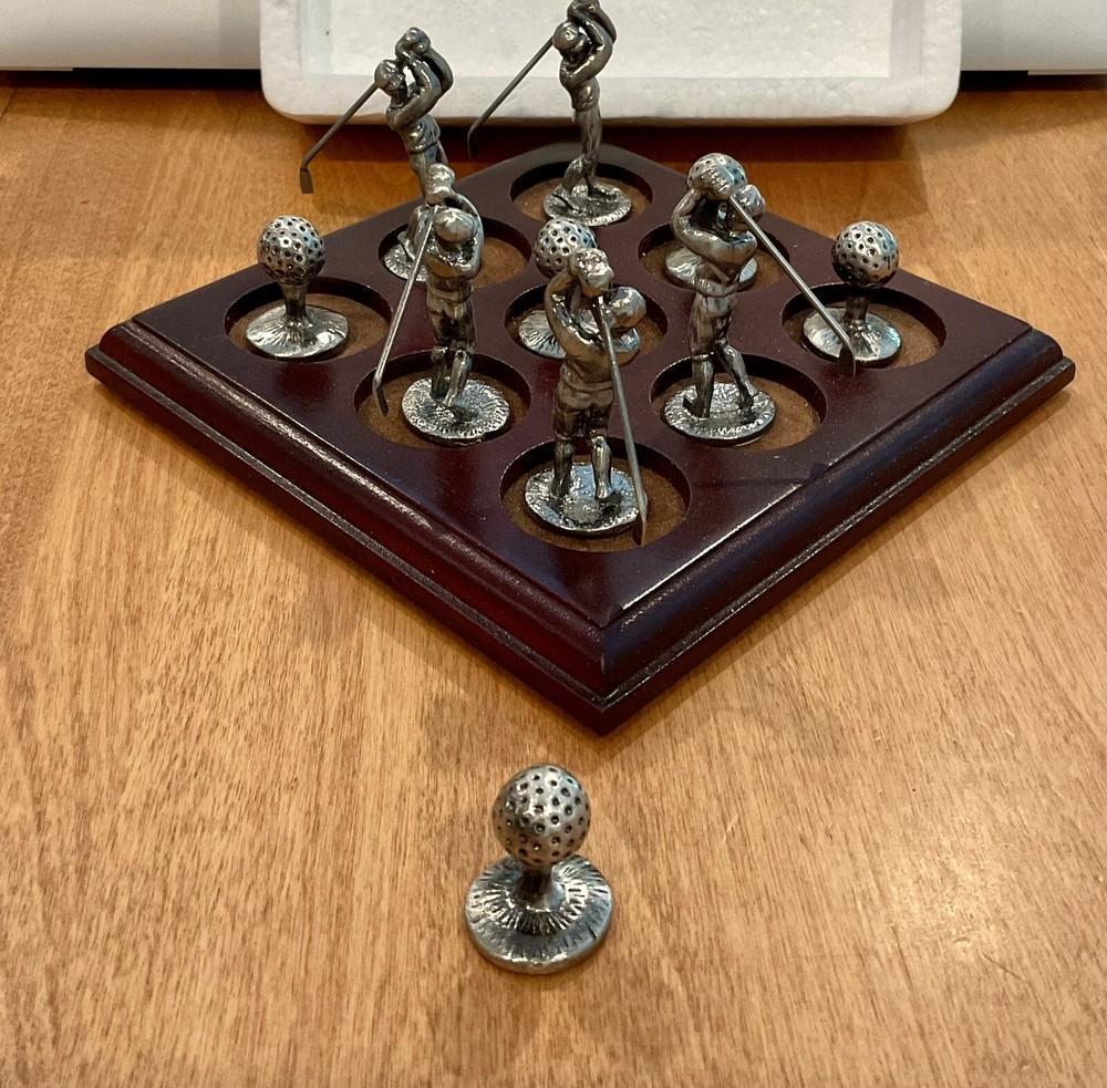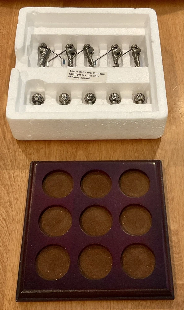 NEW WITHOUT ORIGINAL BOX. WOOD BASED PEWTER GOLFERS AND PEWTER GOLF BALLS FOR A QUICK FUN GAME OF TIC TAC TOE. IN ORIGINAL PACKING BUT NOT THE BOX. UNUSED. THANK YOU FOR LOOKING! PLEASE ENLARGE PHOTOS AND SCROLL THRU ALL OF THE PHOTOS. PLEASE READ SPECIFICS ABOVE. PLEASE CHECK OUT MY OTHER ITEMS. SEE PICS, PRETTY CLEAR ON SIZE AND CONDITION SEE ITEM SPECIFICS ABOVE. IF INTERESTED AND NEED TO ASK QUESTION, PLEASE DO... please scroll thru them all, enlarge as they are an important part of the description. PLEASE ASK QUESTIONS BEFORE BIDDING. I AM HAPPY TO SEND MORE PICS, JUST LET ME KNOW WHAT YOU NEED TO MAKE A WISE DECISION. Please read return policy before buying from me. RETURN SHIPPING AND TRACKING FEES ARE THE RESPONSIBILITY OF THE BUYER. PLEASE CONTACT ME BEFORE LEAVING ANYTHING LESS THAN A 5 STAR RATING SHOULD ANY PROBLEMS ARISE, PLEASE CONTACT ME DIRECTLY THRU THE MESSAGING SYSTEM AND NOT THRU THE RESOLUTION CEN