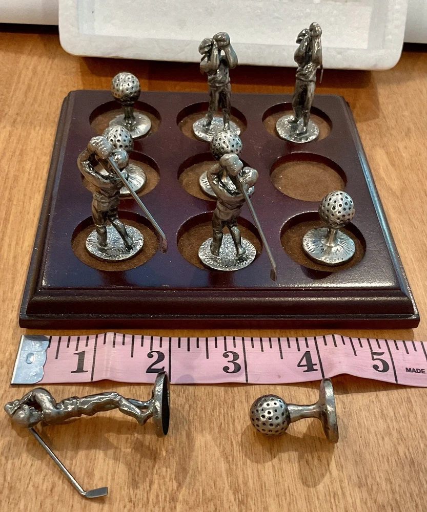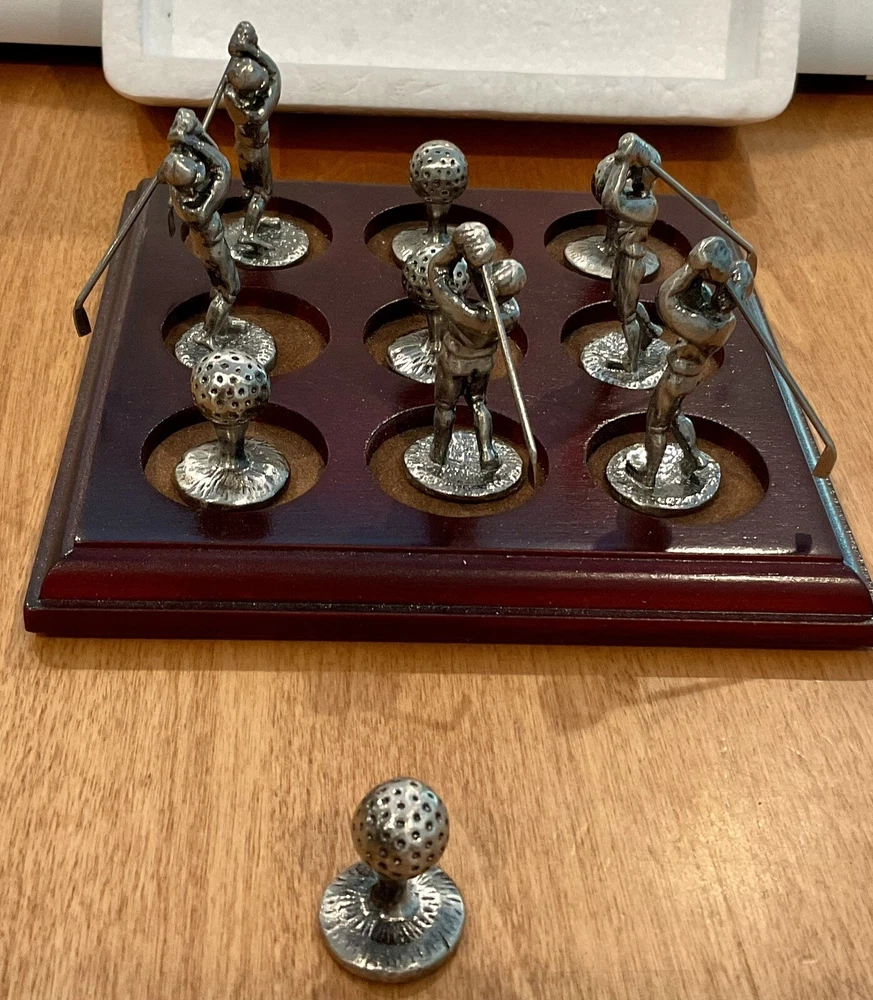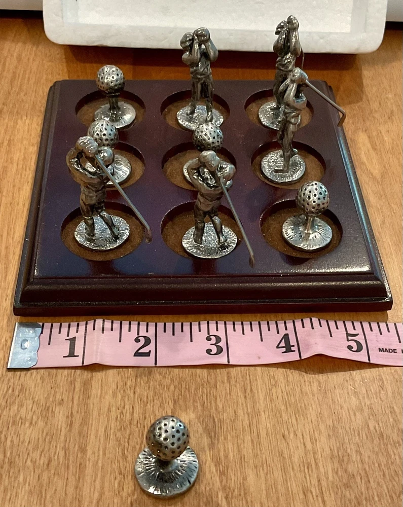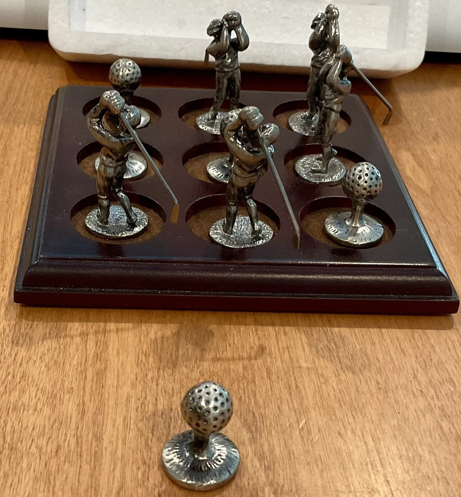 NEW WITHOUT ORIGINAL BOX. WOOD BASED PEWTER GOLFERS AND PEWTER GOLF BALLS FOR A QUICK FUN GAME OF TIC TAC TOE. IN ORIGINAL PACKING BUT NOT THE BOX. UNUSED. THANK YOU FOR LOOKING! PLEASE ENLARGE PHOTOS AND SCROLL THRU ALL OF THE PHOTOS. PLEASE READ SPECIFICS ABOVE. PLEASE CHECK OUT MY OTHER ITEMS. SEE PICS, PRETTY CLEAR ON SIZE AND CONDITION SEE ITEM SPECIFICS ABOVE. IF INTERESTED AND NEED TO ASK QUESTION, PLEASE DO... please scroll thru them all, enlarge as they are an important part of the description. PLEASE ASK QUESTIONS BEFORE BIDDING. I AM HAPPY TO SEND MORE PICS, JUST LET ME KNOW WHAT YOU NEED TO MAKE A WISE DECISION. Please read return policy before buying from me. RETURN SHIPPING AND TRACKING FEES ARE THE RESPONSIBILITY OF THE BUYER. PLEASE CONTACT ME BEFORE LEAVING ANYTHING LESS THAN A 5 STAR RATING SHOULD ANY PROBLEMS ARISE, PLEASE CONTACT ME DIRECTLY THRU THE MESSAGING SYSTEM AND NOT THRU THE RESOLUTION CEN