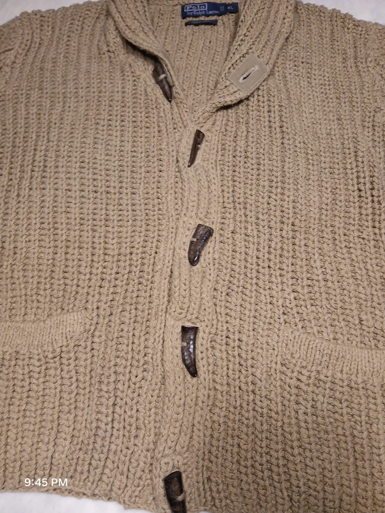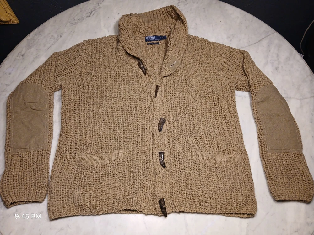 This is a vintage Polo Ralph Lauren cardigan sweater for men in size XL. It features a shawl collar, a solid beige color, and is hand knitted with a tight-knit pattern. Made of a blend of linen and cotton, this heavyweight sweater has long sleeves and button accents. Suitable for various occasions such as travel, weddings, parties, casual wear, work, or formal events. The style is described as athletic fit with a classic, preppy theme, perfect for winter, fall, and spring seasons.