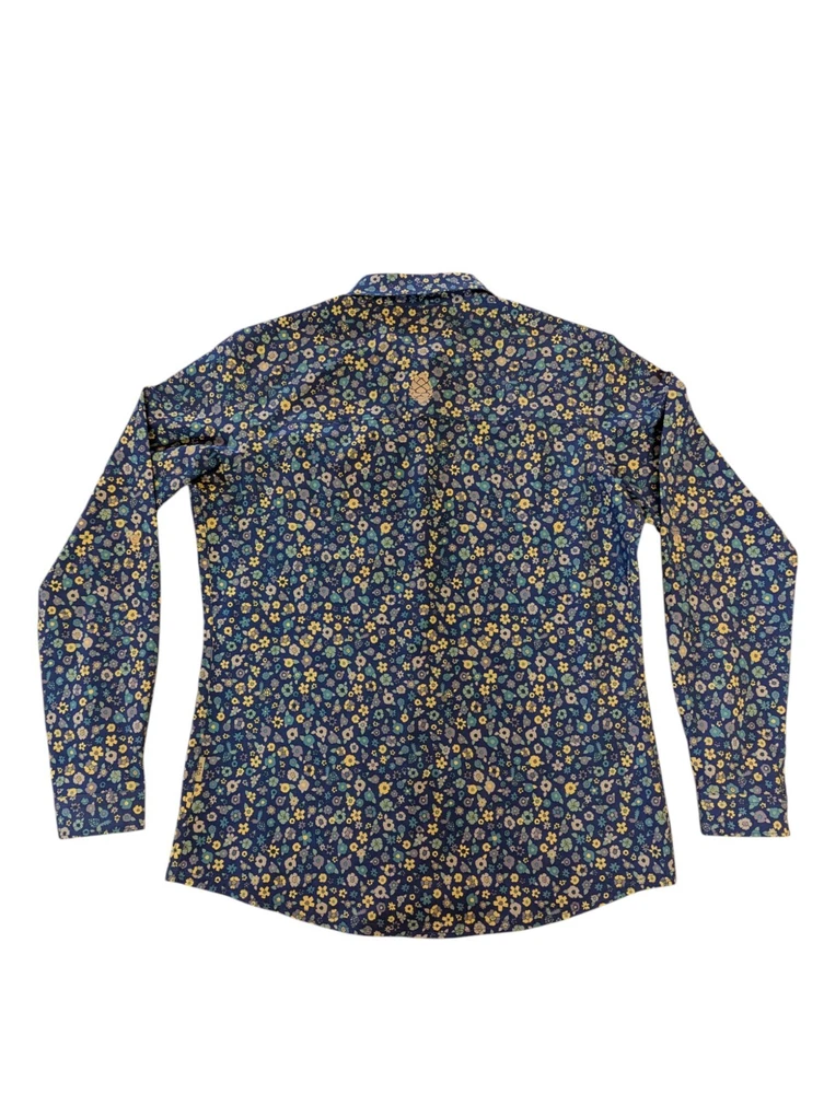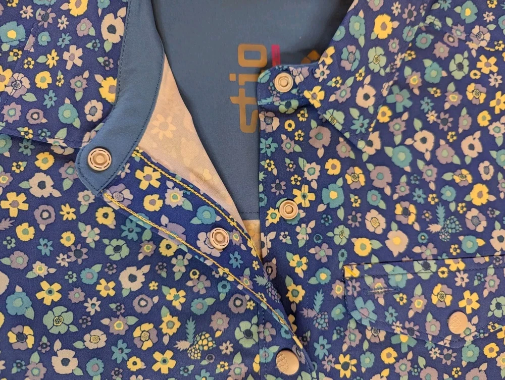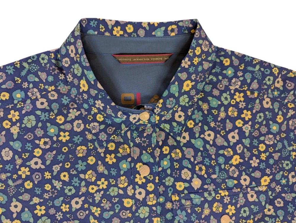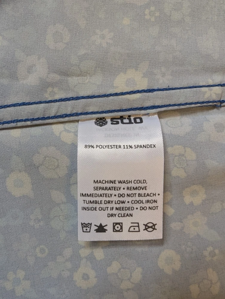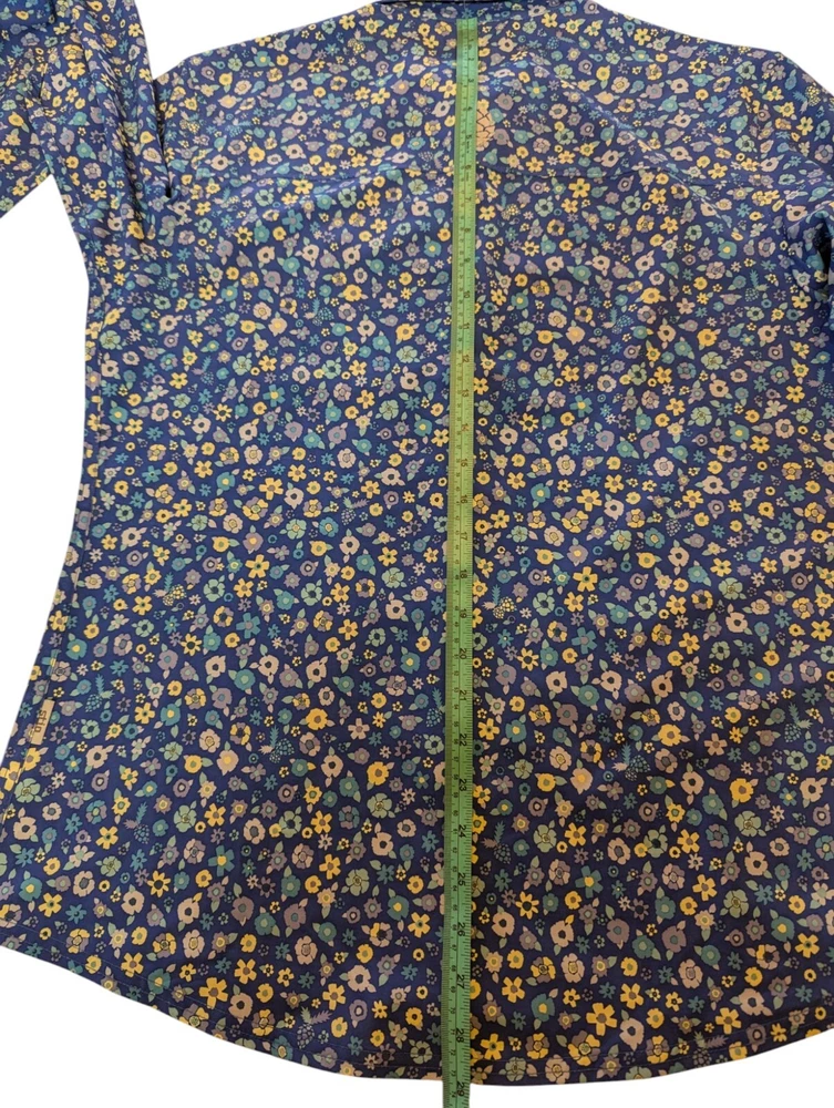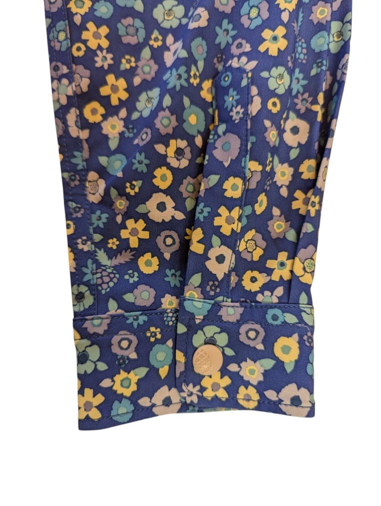 STIO Womenss floral print long sleeve stretch shirt. Great for many occasions: outdoors and indoors. Size Large, semi-fit style. Snap closure. Wrinkle free material, easy care. The shirt is new, without a tag. Check my pictures for measurements and details, please.