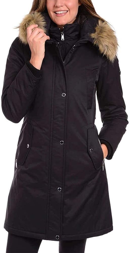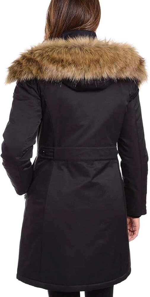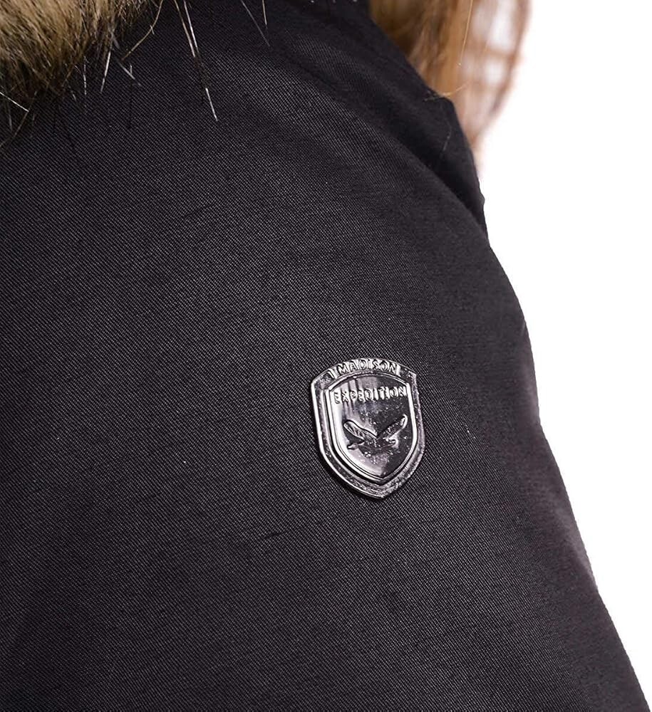 Stay warm and stylish with this black 1 Madison Ladies Water Resistant Faux Fur Hooded Parka. It features a softshell fabric type with a hood, fur trim, button, zipper, and logo accents. The closure includes a zip, button, and snap for added security. The parka also comes with removable lining, zipped pockets, and an adjustable waist for a comfortable fit. Ideal for travel, casual wear, workwear, and business, this long jacket has a regular fit and is made with nylon outer shell material and polyester lining material. The insulation material is also polyester, and the jacket has knit storm cuffs for added protection against the winter and fall seasons. This item is perfect for women who want to stay warm and fashionable without compromising on comfort and style.