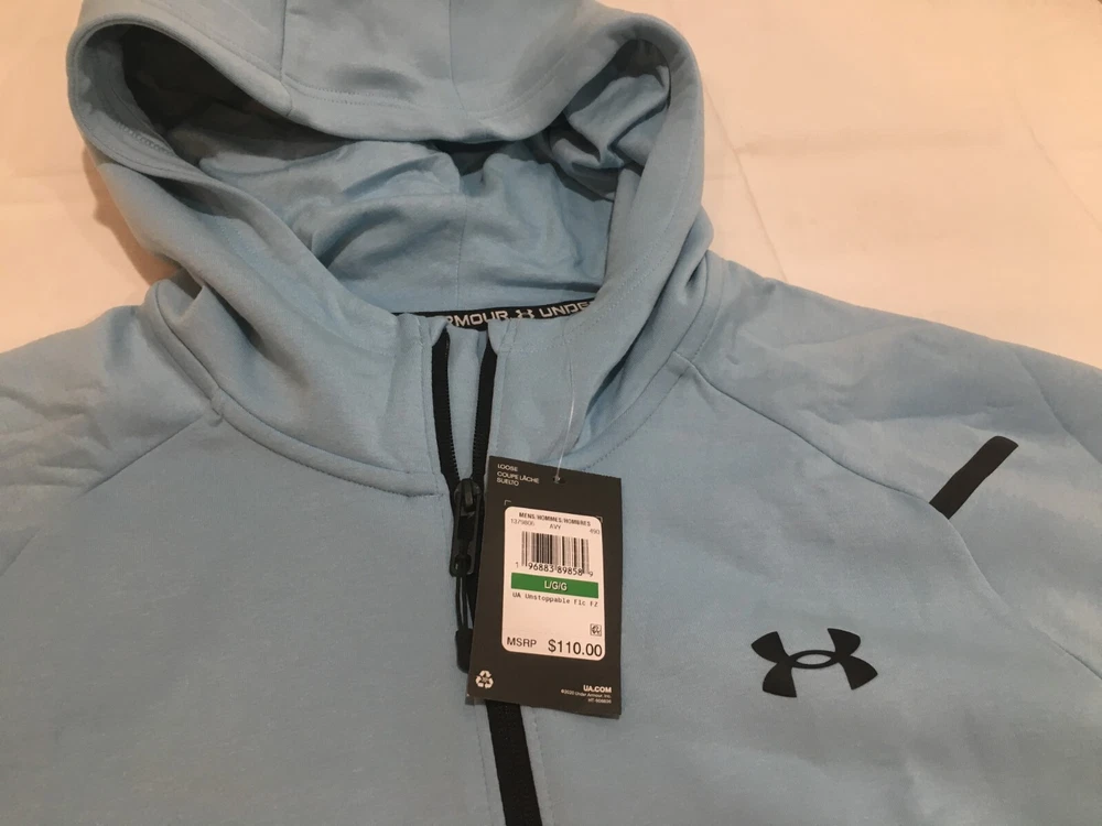 Welcome to my auction for a Brand New w/ Tags Under Armour Mens Unstoppable Fleece Full Zip Long Sleeve Hoodie. This awesome top of the line hoodie features : Double-knit fabric is soft, stretchy & breathable for superior comfort & mobility Material wicks sweat & dries really fast 4-way stretch material moves better in every direction Secure, zip hand pockets Dropped, shaped hem for enhanced back coverage Binding at cuffs & bottom hem Raglan sleeves Loose : Fuller cut for complete comfort. Style #: 1379806 65% Polyester/29% Cotton/6% Elastane Imported The color is blue / navy blue with the UA logo on the chest - very cool! This listing is for a size LARGE (P icture may be of different size) . This shirt retails for $110.00. I guarantee the authenticity of all of my items - check my feedback and know that you are purchasing from a trusted source. Winning bidder to add $10.00 for shipping (international add $40). Check my other auctions for more great items available for sale. Thanks for viewing my auction!