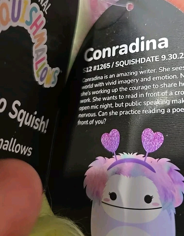 Meet CONRADINA, the Bigfoot Yeti from the Squishmallows brand. This adorable plush doll is perfect for Easter and any occasion. It comes in a medium size of 14 inches, with a beautiful purple color that will make you smile. This Select Series plush doll is not only cute, but also washable and perfect for kids of all ages. From 3 to 17 years old, everyone can enjoy the cuddles and playtime with CONRADINA. So why wait? Add this lovable Bigfoot Yeti to your collection today! C1