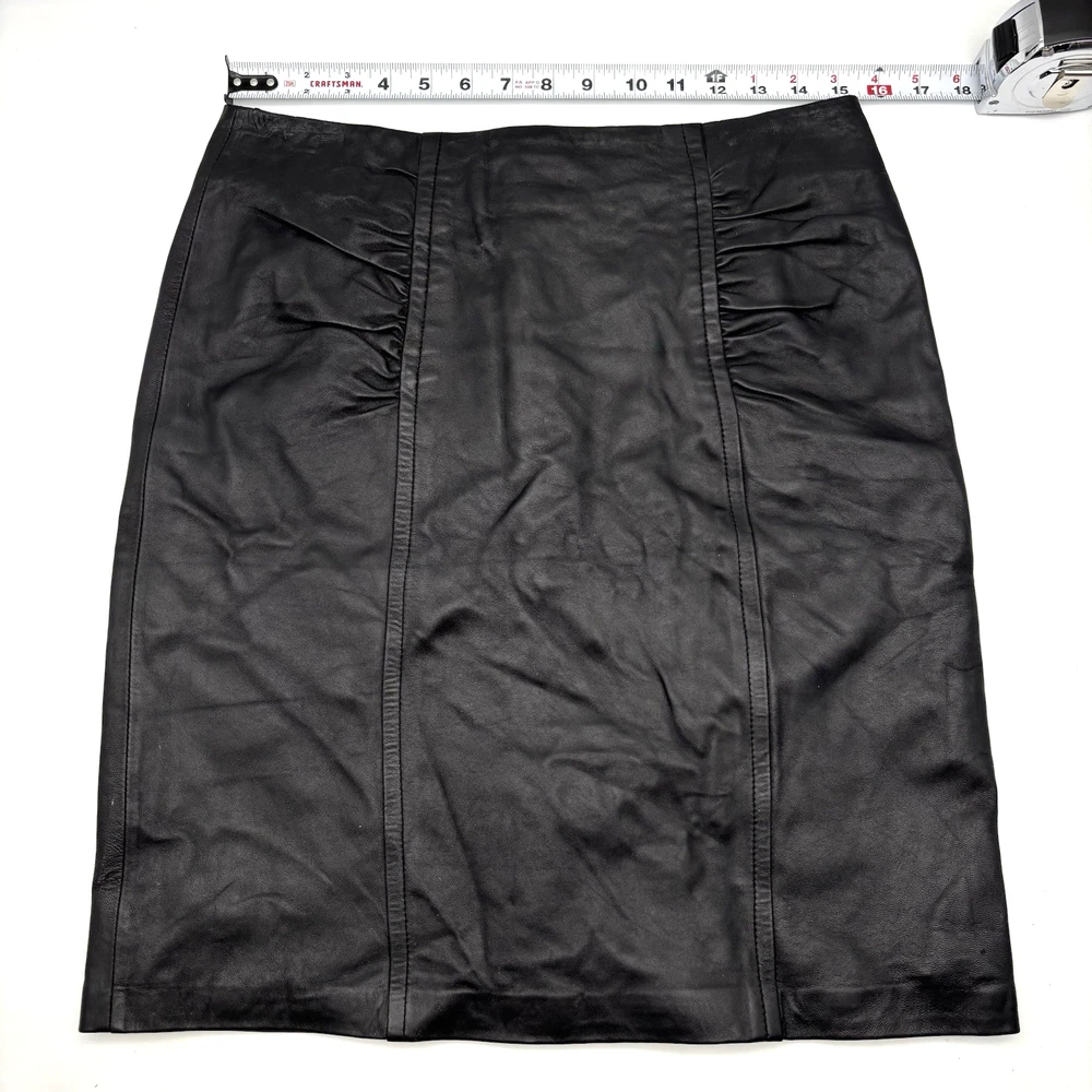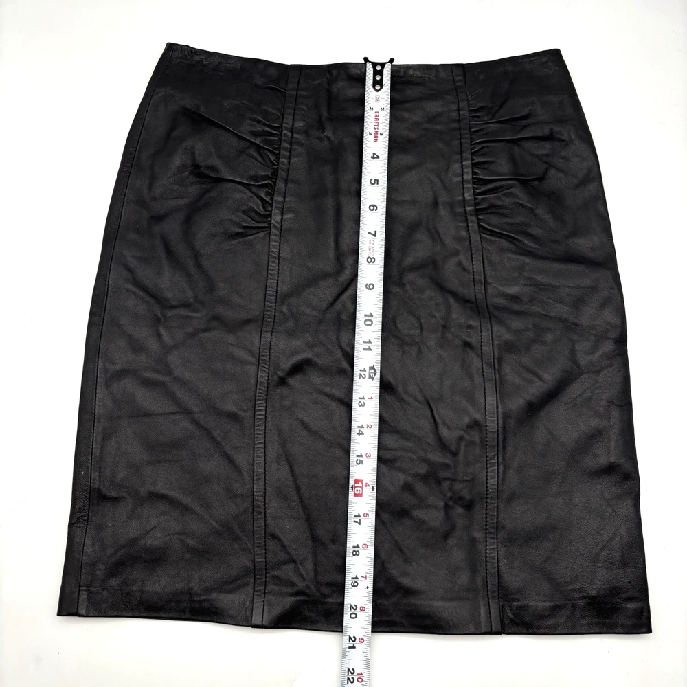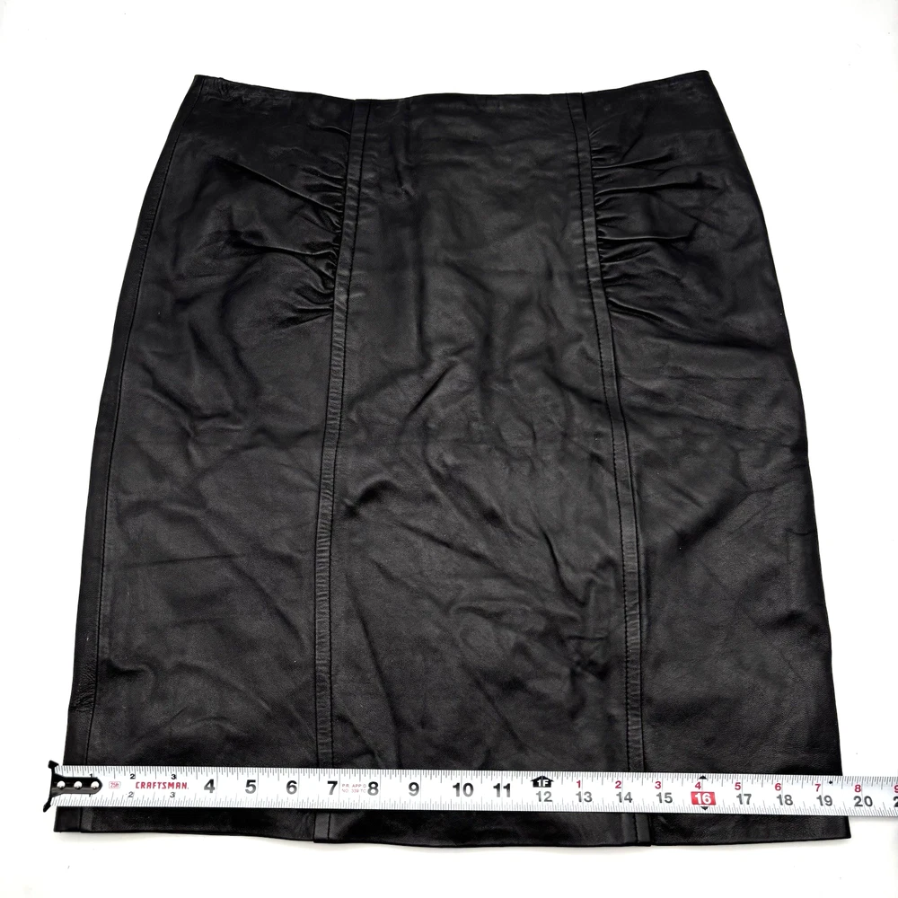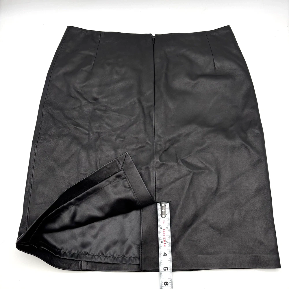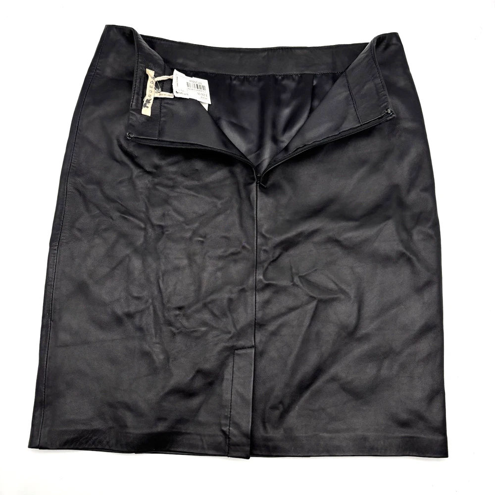 NEW 2008 in SUEDE Leather Pencil Skirt 100% Leather 100% Polyester Lining Solid Black Knee Length Flat Front No Pockets Zip and Hook & Eye Closure on Back Supple Leather No stretch! Professional Clean Only MSRP: $230.00 Women's Size 8 Please refer to measurements below to ensure accurate fit before purchase! 15" waist (30" circumference) 19" hips 19.5" hem 20.5" full length from waist to hem Measurements made with garment laying flat. Brand new, never worn condition with the original tags. No rips, tears, stains, holes or other notable flaws. Clean and from a smoke free home.