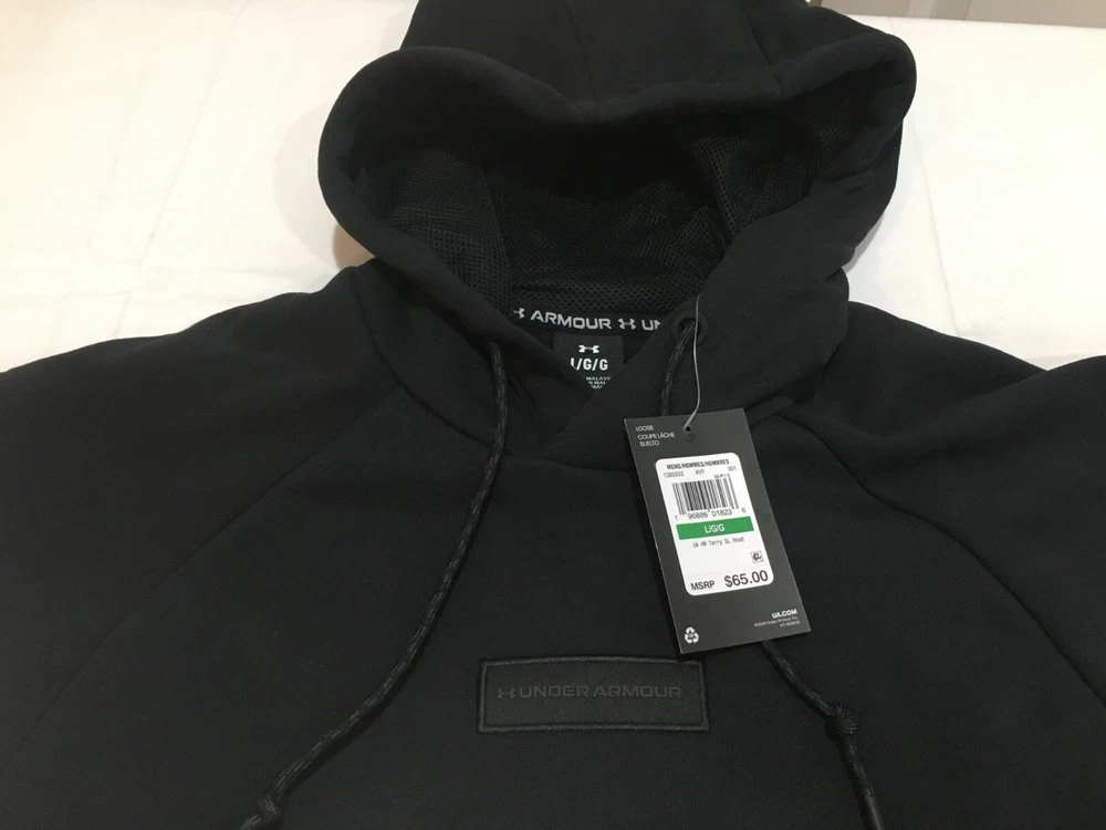 Welcome to my auction for a Brand New w/ Tags Under Armour Mens Heavyweight Terry Sleeveless Hoodie. This awesome top of the line hoodie features : Loose fit hoodie Cotton-blend heavyweight terry is super soft and comfortable with a classic athletic feel Hooded design lets you personalize your fit Sleeveless construction offers complete range of motion Front kangaroo pocket provides storage for the essentials Brand : Under Armour Country of Origin : Imported Style : 1385933 Fabric : 73% cotton / 27% polyester The color is black with the UA logo on the chest - very cool! This listing is for a size LARGE (P icture may be of different size) . This shirt retails for $65.00. I guarantee the authenticity of all of my items - check my feedback and know that you are purchasing from a trusted source. Winning bidder to add $9.00 for shipping (international add $40). Check my other auctions for more great items available for sale. Thanks for viewing my auction!