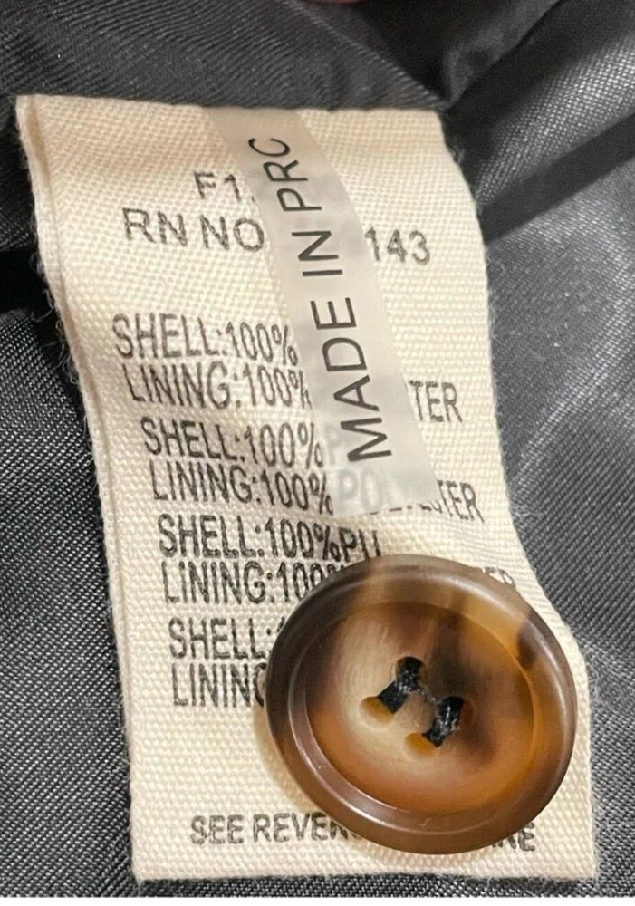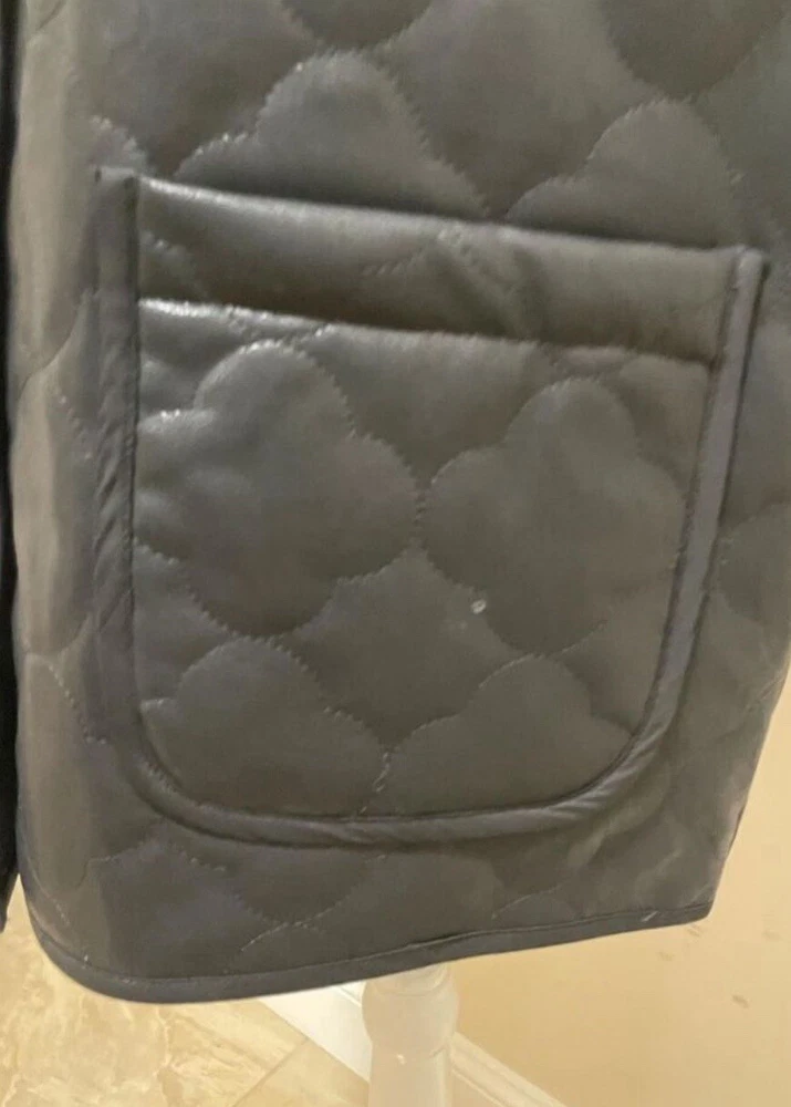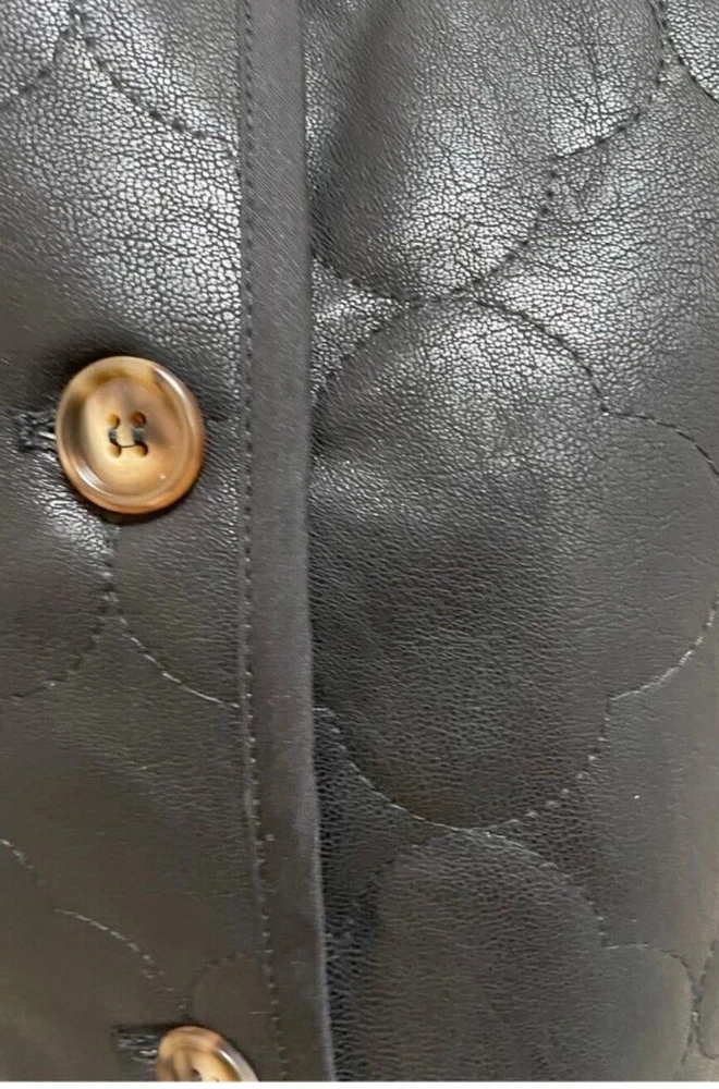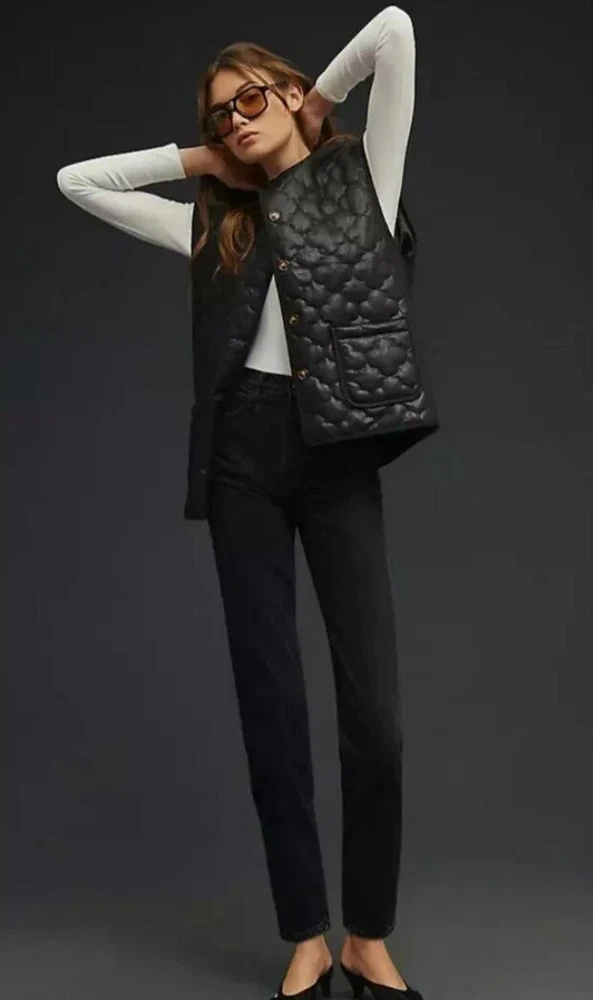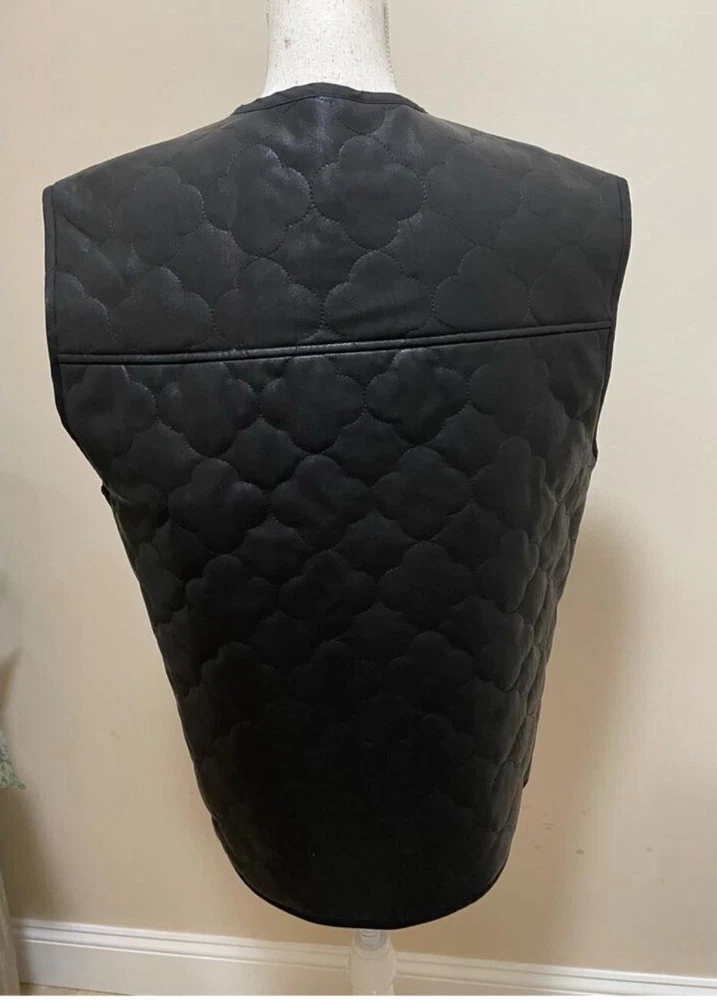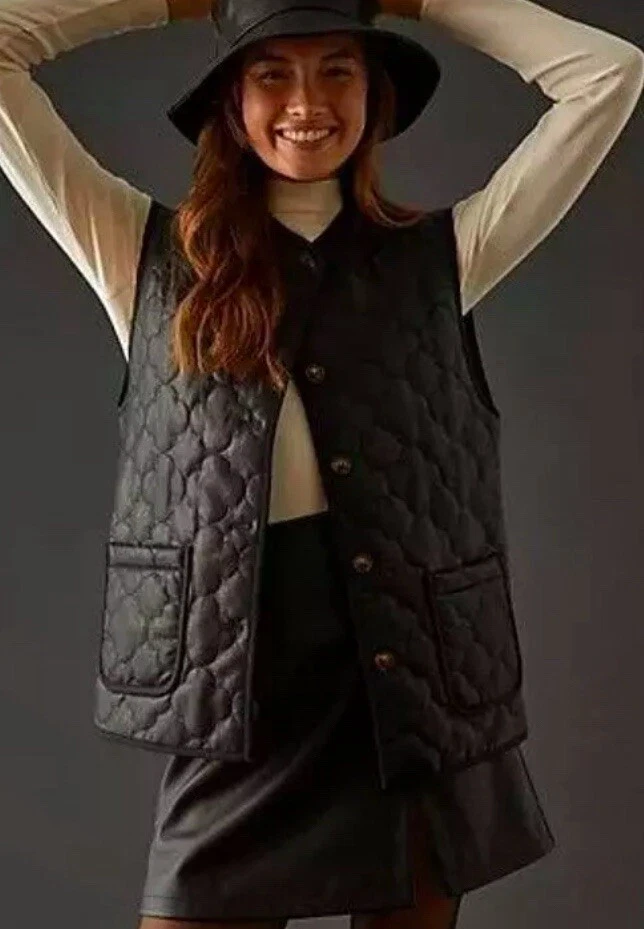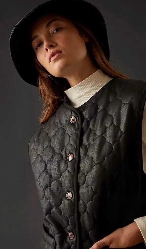 NWT FRNCH Paris x Anthropologie Rare Faux Leather Sleeveless Quilted Gisette Vest Black Button Front OS. Retail $150 Sleeveless waistcoat. Button closure. Patch pockets. 100% polyurethane. Lining = 100% polyester. Dry clean. Brown tortoise shell style buttons down front. Extra button on care tag. FRNCH Paris Faux Leather Sleeveless Quilted Gisette Vest Black Button Front OS ethane. Lining = 100% polyester. Dry clean. Brown tortoise shell style buttons down front. Extra button on care tag. Brand new items 100% Authentic Bust 43" Line through Name tags (Inside tag) only done to prevent store returns