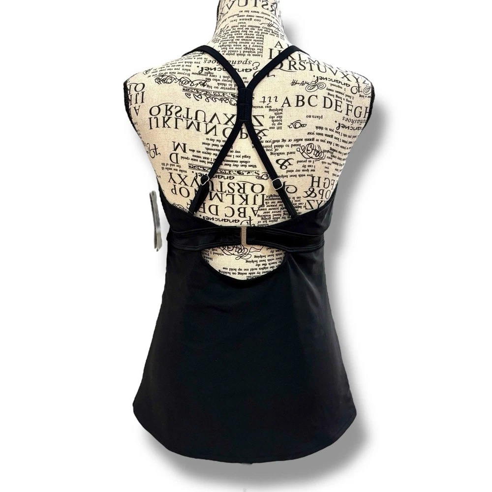 Elevate your beach day style with this Athleta tankini swim top. The black solid color and waterfall bandeau style offer a sleek and trendy look, perfect for a day at the pool or a trip to the beach. This swim top features adjustable straps, removable pads, and a built-in bra for added support and comfort. Crafted for women who desire both style and function, this Athleta swim top is a must-have addition to your swimwear collection.