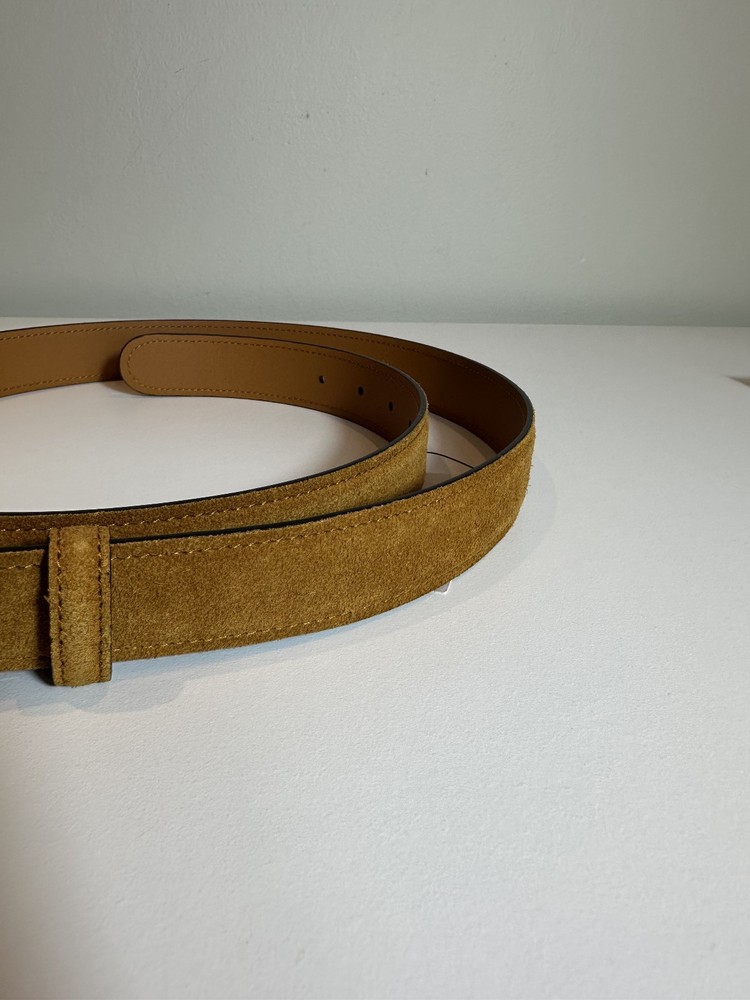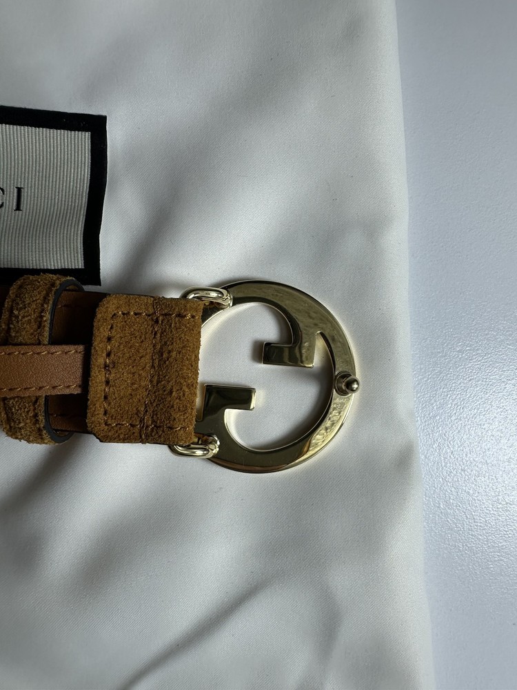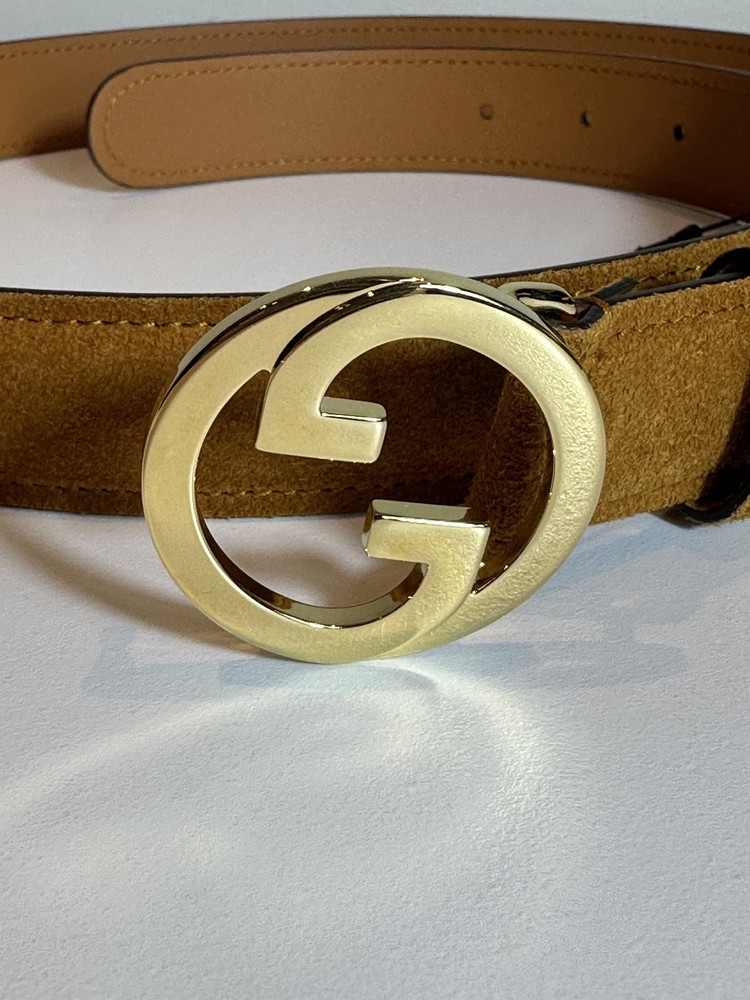 Gucci Suede Leather Belt with Interlocking GG **Please note the minor scratch on the buckle** (see the buckle photo) Size: 100 cm / 40 inch Width: 1.2 inches Color: Tan/Gold Material: Suede (outer), smooth leather (inner) Buckle: Polished gold-tone interlocking GG Made in Italy Condition: New in box (NIB) Includes: Belt only (box/dust bag not shown)
