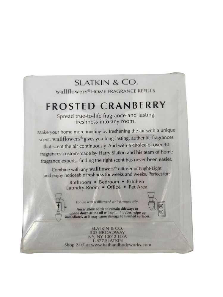 NWT Bath & Body Works Wallflowers Home Fragrance Refills Frosted Cranberry R20 New with tags NWT Bath & Body Works Wallflowers Home Fragrance Refills Frosted Cranberry 2 Pack. Fruity yet refined, a seasonal mainstay with this inspiring blend of iced cranberries, blonde woods, red apple Vintage Bath & Body Works Slatkin & Co. Frosted Cranberry Wallflowers Home Fragrance Refills, 2-Pack (1.6 fl oz total) FRAGRANCE: iced cranberries, blonde woods, red apple OVERVIEW: Fragrance that welcomes you home! Combine with your favorite Wallflowers Fragrance Plug, sold separately, to scent any room with noticeable fragrance for weeks and weeks. Made in USA. This item is new with tags, no defects. Only removed from box for pictures.
