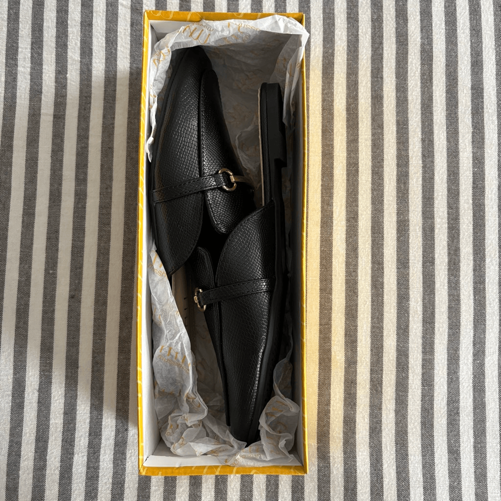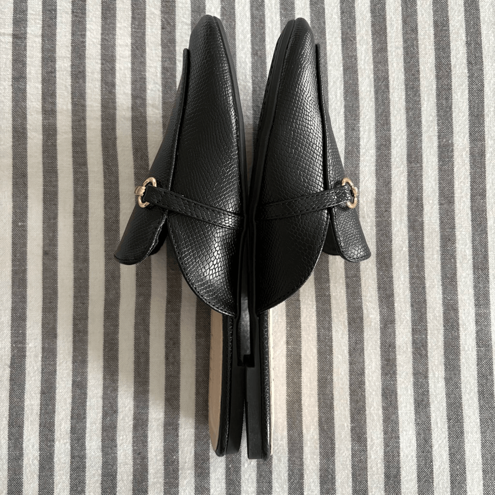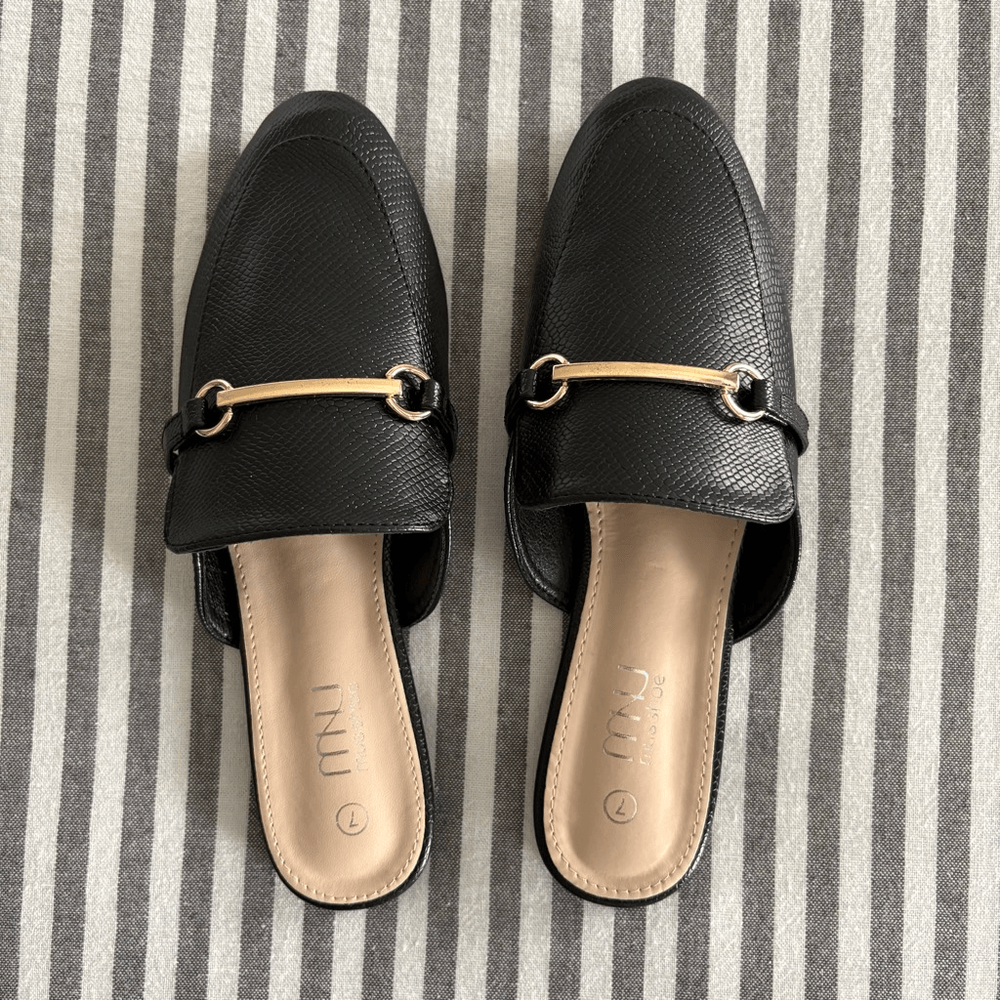 NWT Black Mules Black with Gold Buckle - Women’s Size 7 - Featuring a classic gold-tone horsebit detail, these mules instantly add a polished, expensive look to any outfit - high-density memory foam insole offers pillow-soft cushioning - Crafted from high-quality, skin-friendly materials, the upper is soft and flexible - backless loafers combine the sharp look of a dress shoe with the ease of a slipper - Built with a sturdy, rubber outsole, these flats provide excellent traction on smooth floors. The lightweight construction ensures a quiet, confident walk, so you can move around the office without making awkward clicking noises.