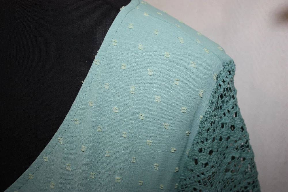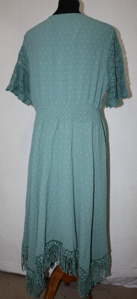 Welcome to Pim's clothing sales Mint green dress with Swiss dot designs. Pullover. Elastic Empire waist. Crochet lace short sleeves and fringed hem. Brand: Bloomchic Material: 100% Polyester body, Cotton and Nylon lace Size: 12 US tagged - see measurements below Shoulders: 17 Bust: 22 armpit to armpit Waist: 16 measured across Length: 49 shoulder to hem (Ask if you need more measurements) Please Remember all Clothing Items may fit differently depending on Brand, Fit, Use or Prior customization. We strongly urge our customers to check measurements first to guarantee proper fitting. Please be sure to check out our listings frequently for more high quality Designer Brand clothing items at a fraction of the price. We are getting new inventory all the time! You never know what amazing deals you may find :) Shipping discounts will be provided for multiple purchases - Please contact us after multiple purchases for an updated invoice.