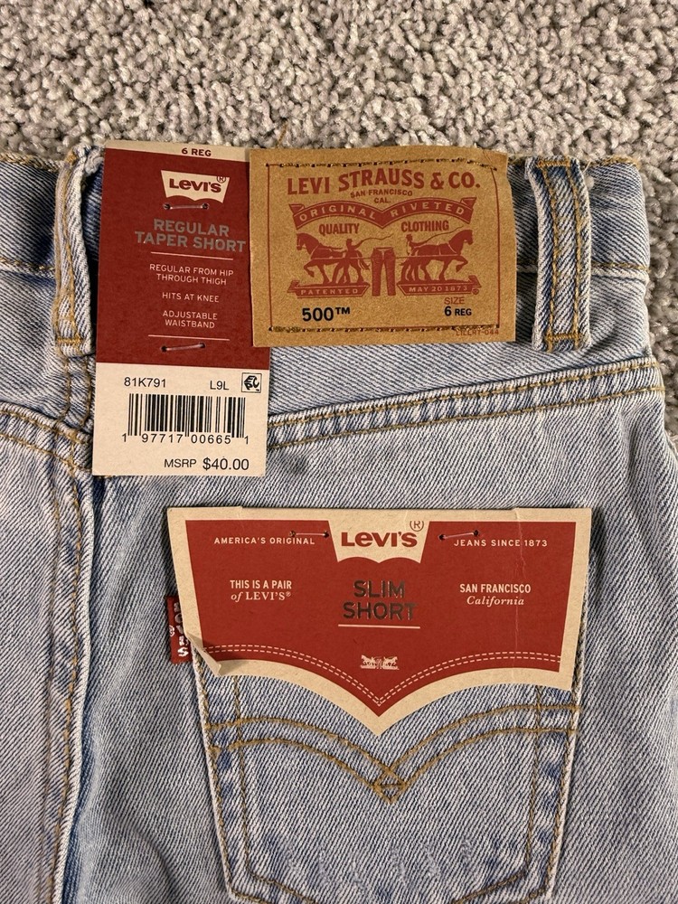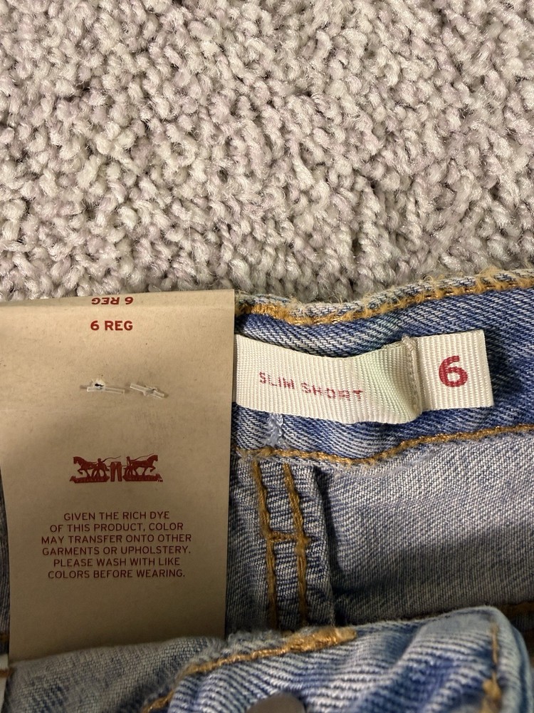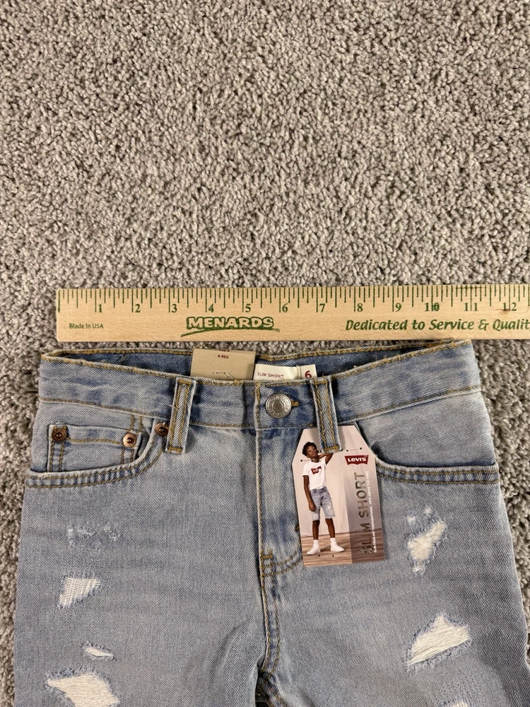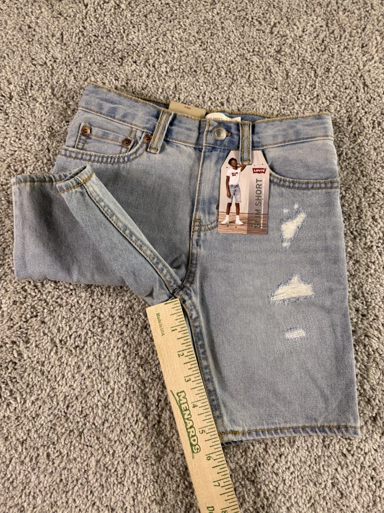 The product is a pair of NWT Boys Levi's Jean Shorts in size 6 regular, featuring a solid blue color and denim fabric. These shorts have a zip closure, light fabric wash, and are machine washable. They are made of cotton and are designed in a regular fit for comfort. The style is a chino, perfect for boys' everyday wear. Made by Levi's, these shorts are a versatile and durable addition to any boy's wardrobe. 4759