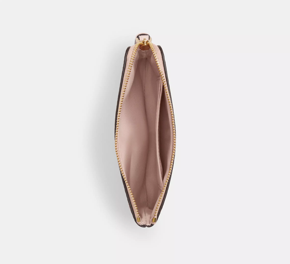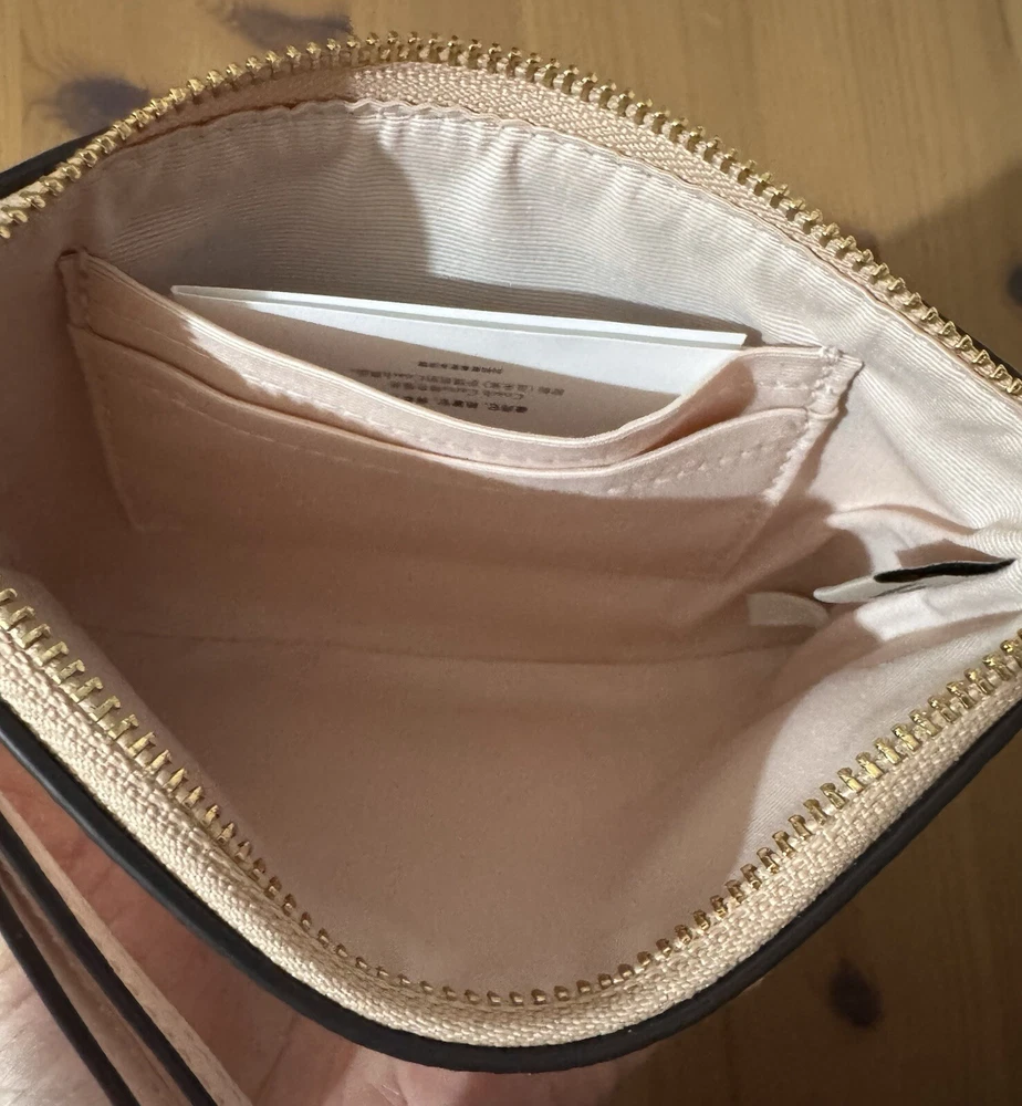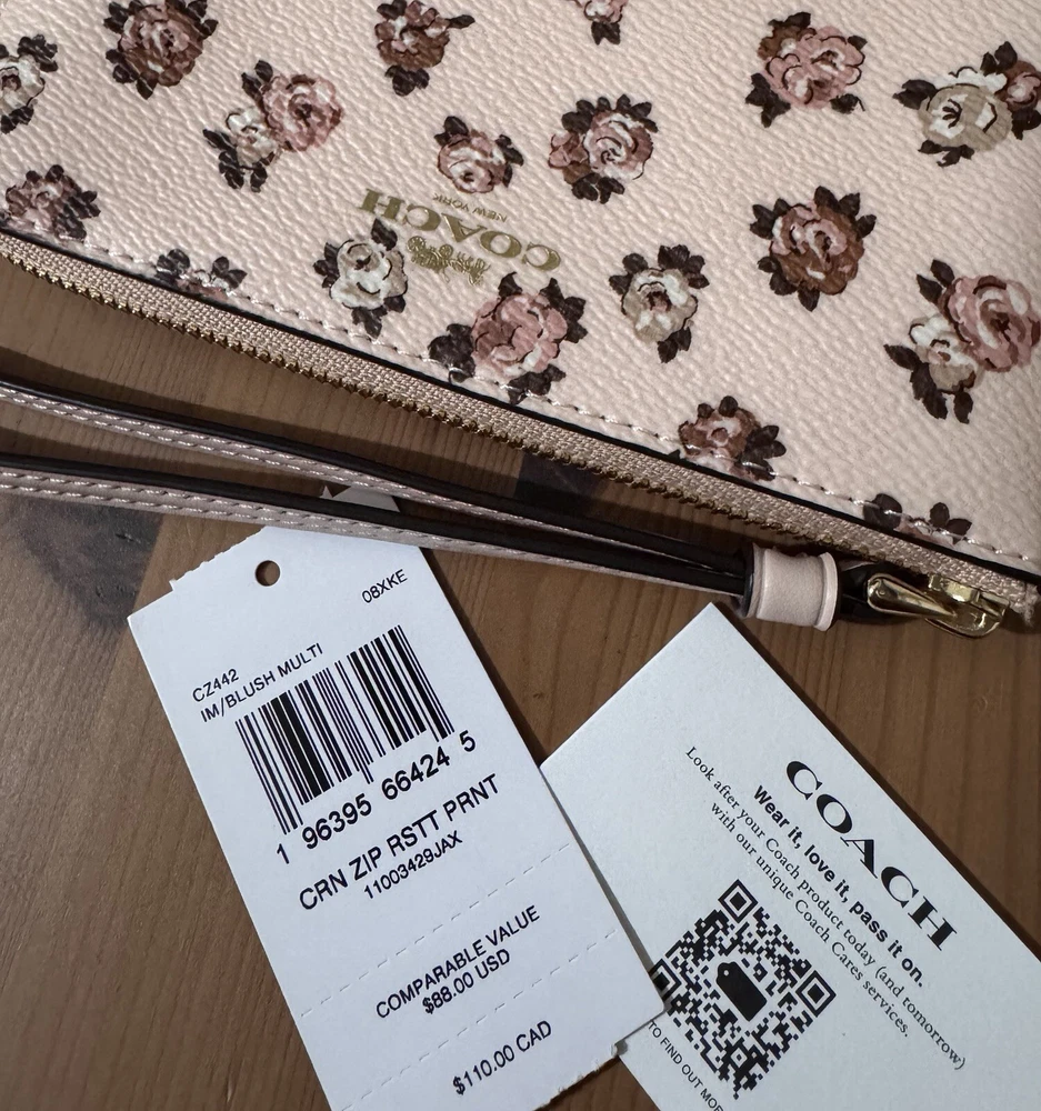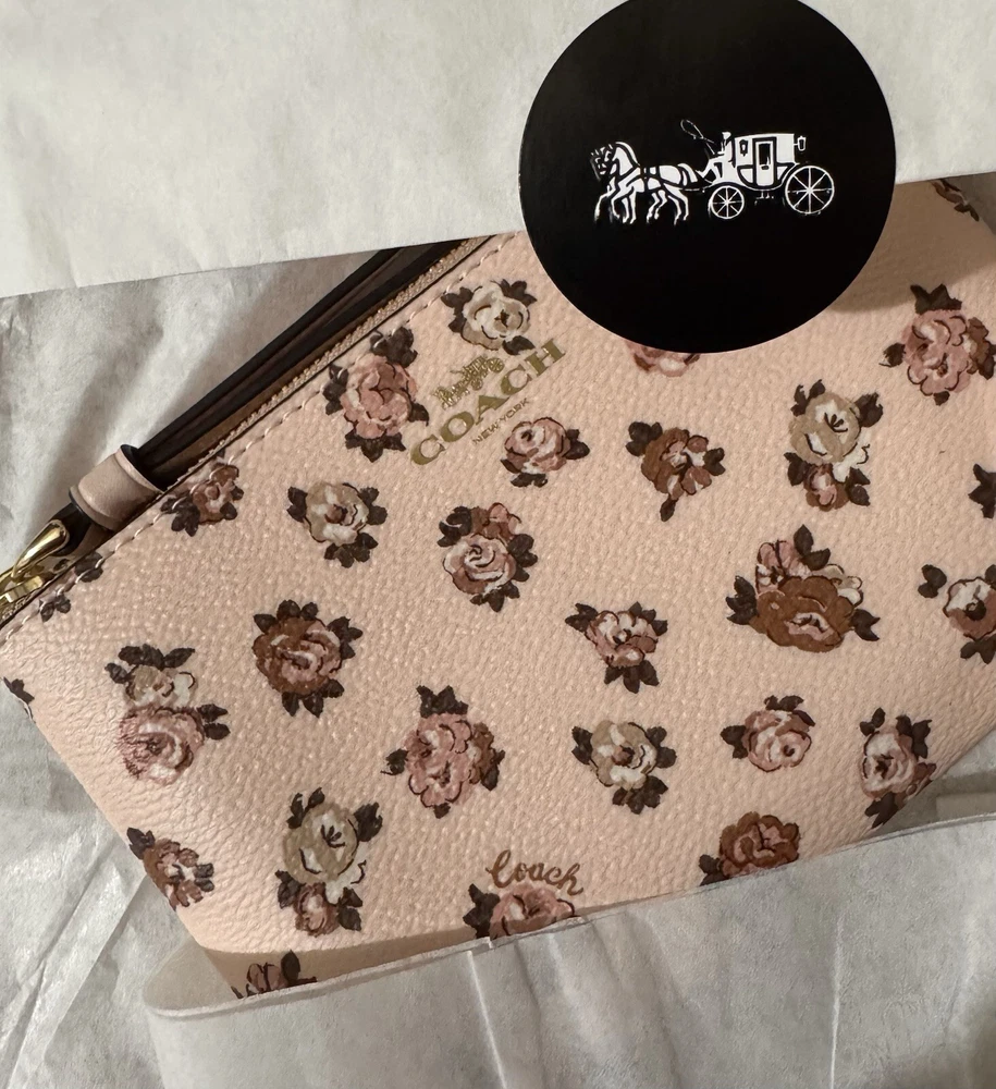 This Coach wristlet is so cute and practical! The rosette print in blush pink is gorgeous, and the coated canvas feels durable. Love the two card slots inside—perfect for quick errands. The wrist strap makes it easy to carry, and the size is just right for essentials. Feels luxurious and well-made, definitely worth it! 🌸