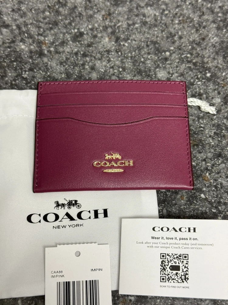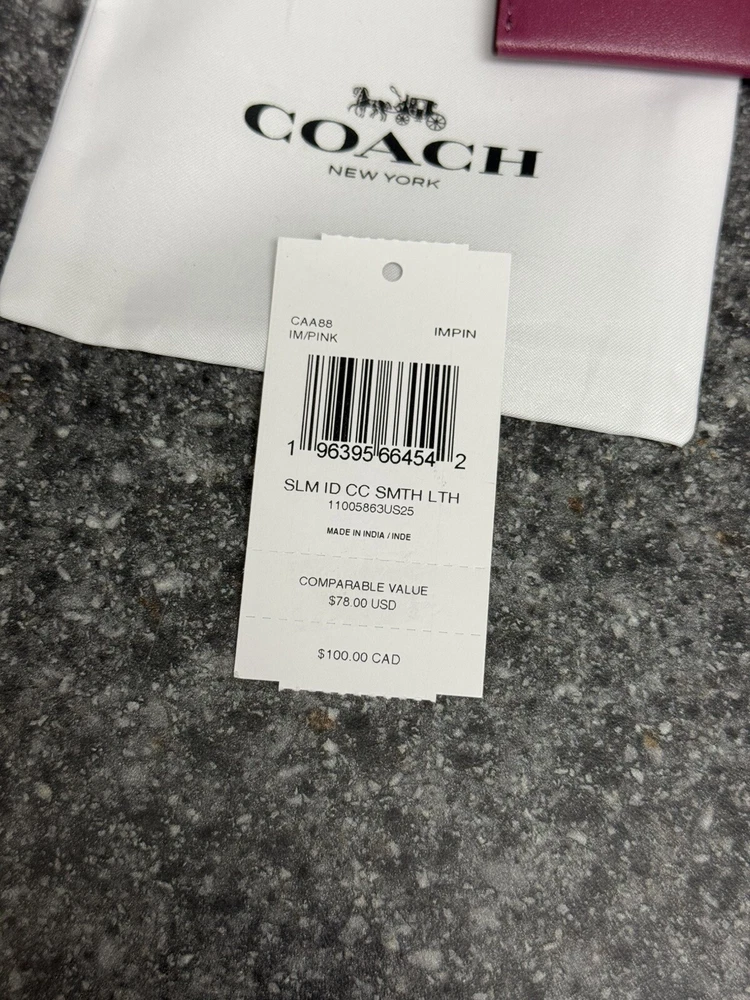NWT COACH CAA88 Slim Id Card Case In Soft Refined Leather Gold/Pink + Dustbag This coach card holder is brand new with tags and comes with its care card and dust bag. It features three card slots on the front, three card slots on the back, and the top opening middle pocket. $78 USD Retail Will ship the next day via usps! Please let me know if you have any questions or offers!