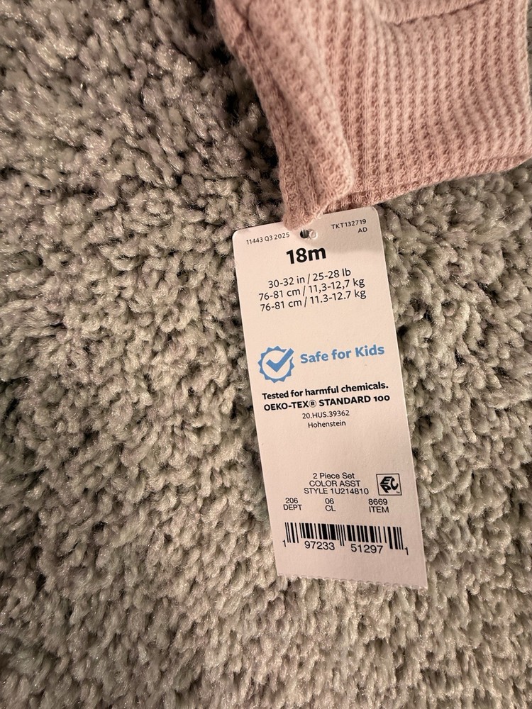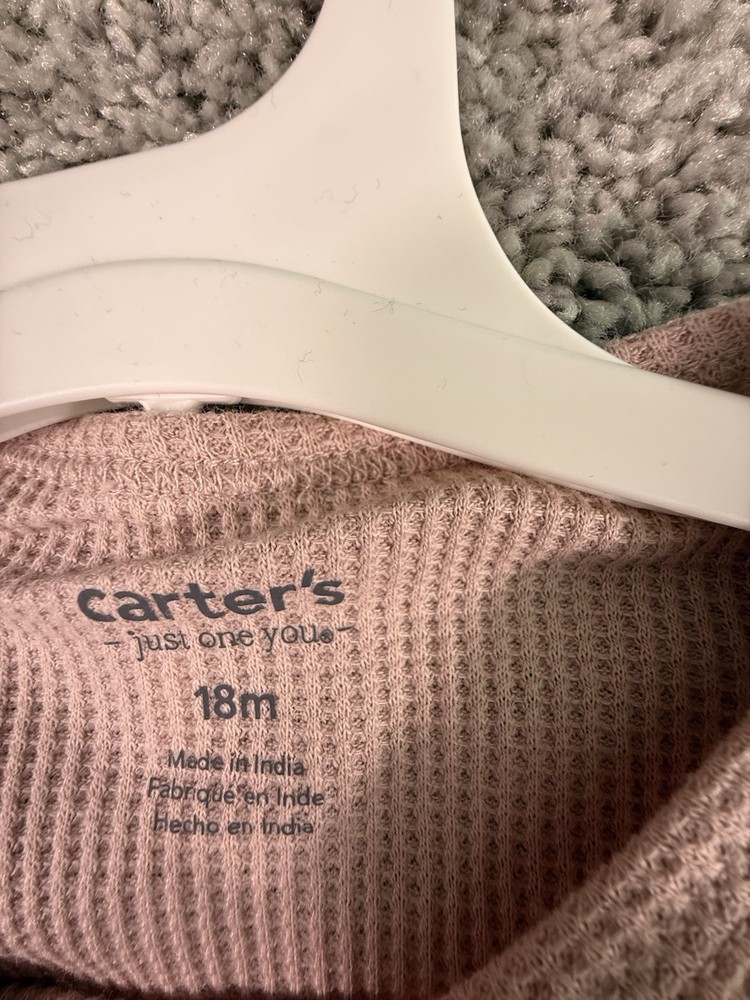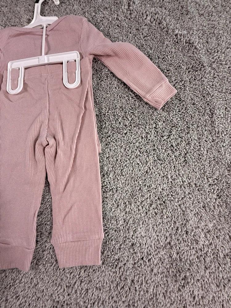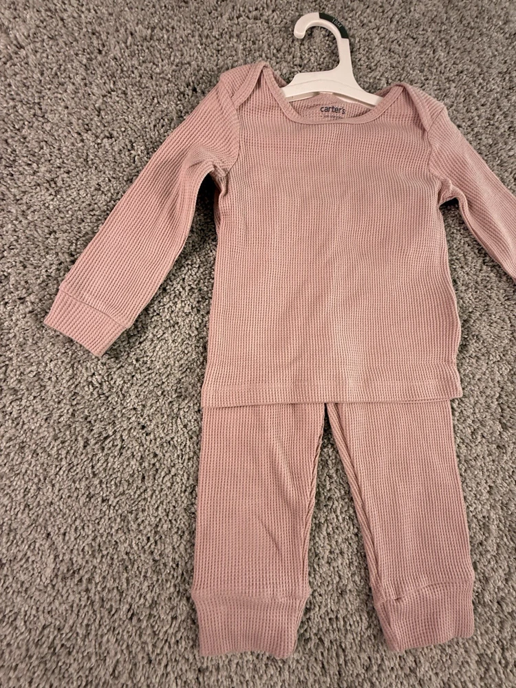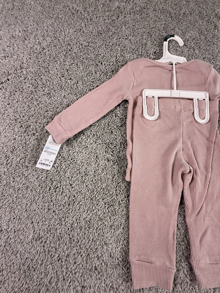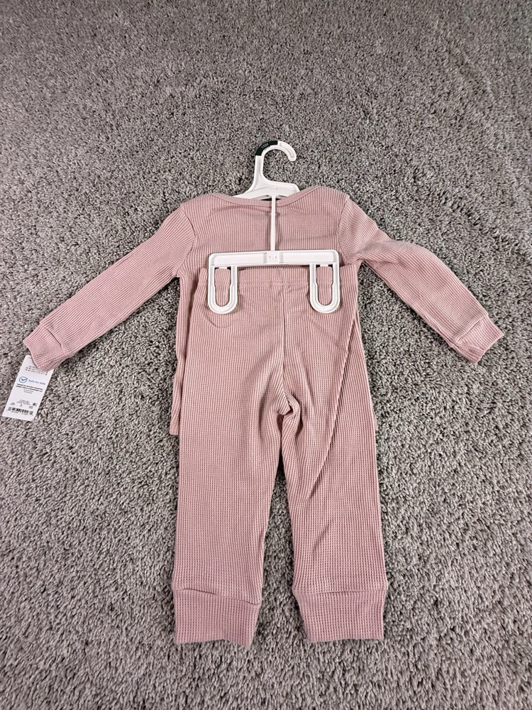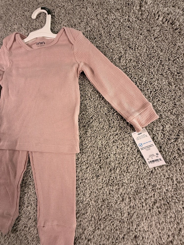 The NWT Carter's Just One You 18 Months Pink Waffle Knit Thermal Pajama Set is a cozy and adorable two-piece outfit perfect for your little girl. Made of soft cotton knit fabric, this pullover set features long sleeves and a solid pink color, ideal for the winter, fall, and spring seasons. With a snug fit and easy care instructions (machine washable), this pajama set from Carter's Just One You ensures both comfort and convenience for your child. 6169