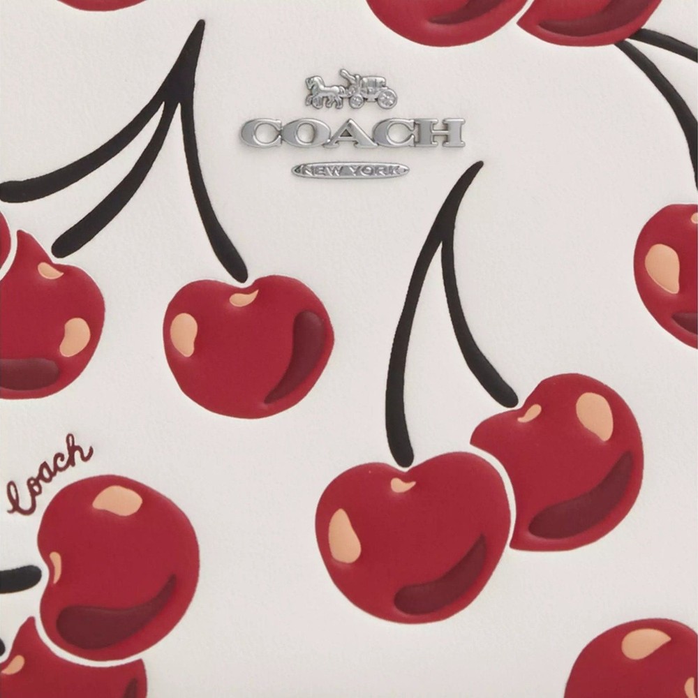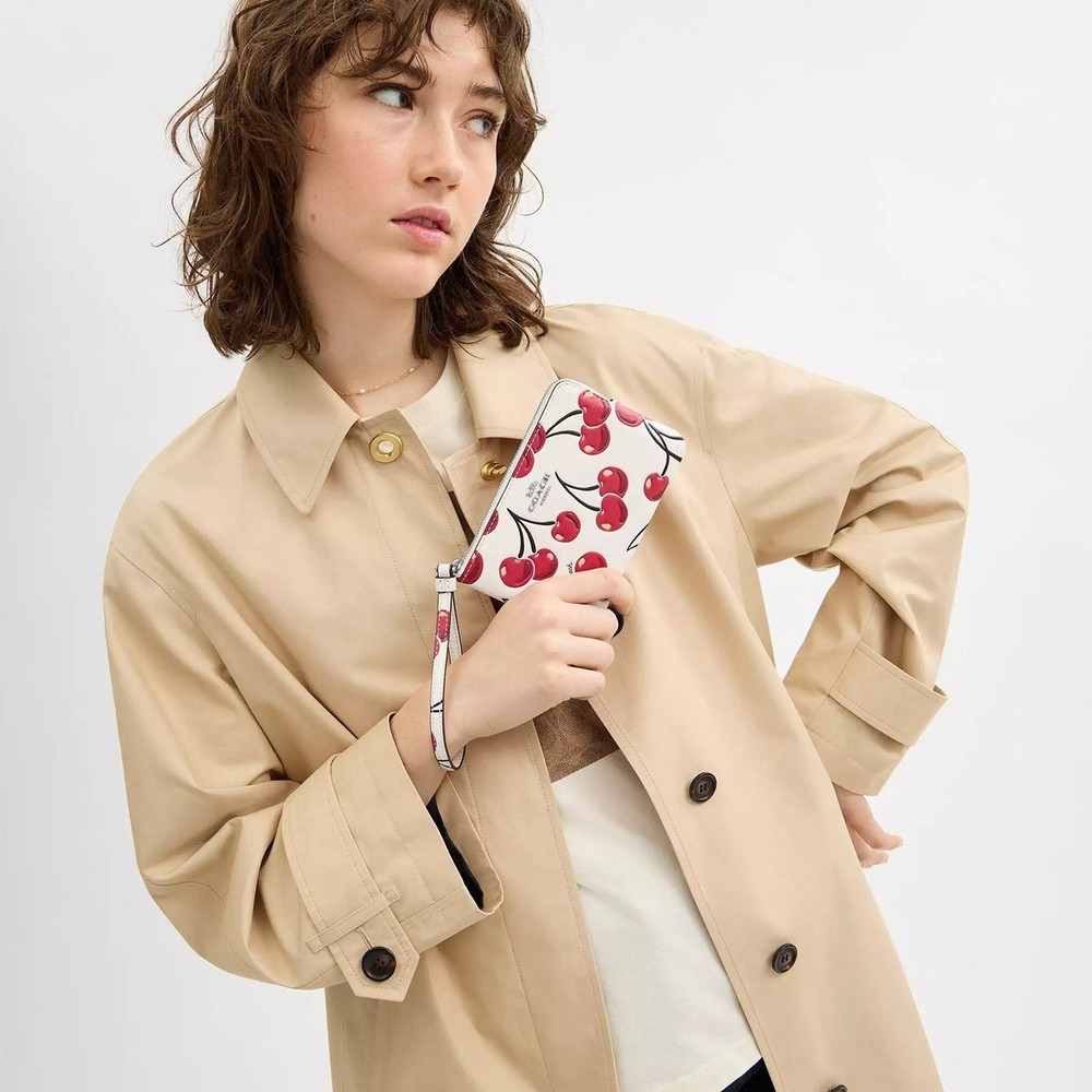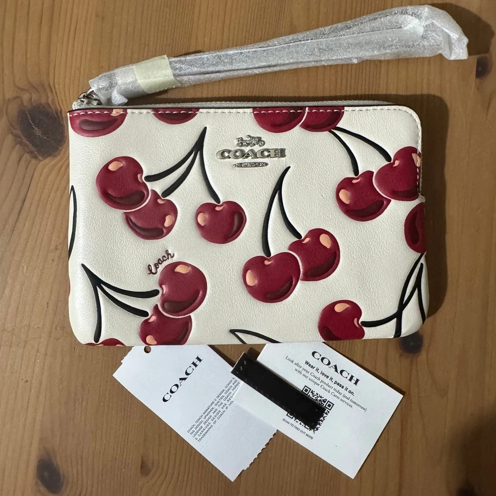 This cute Coach wristlet is the perfect combo of style and function! The cherry print is adorable, and the smooth leather feels so luxe. Fits essentials with two card slots and a zip-top to keep everything secureβlove the attached wrist strap for easy carrying. Compact yet surprisingly roomy, it's a must-have for quick errands or nights out!