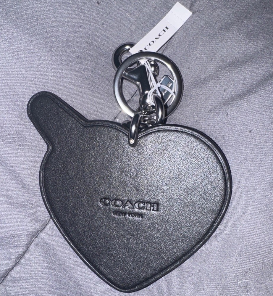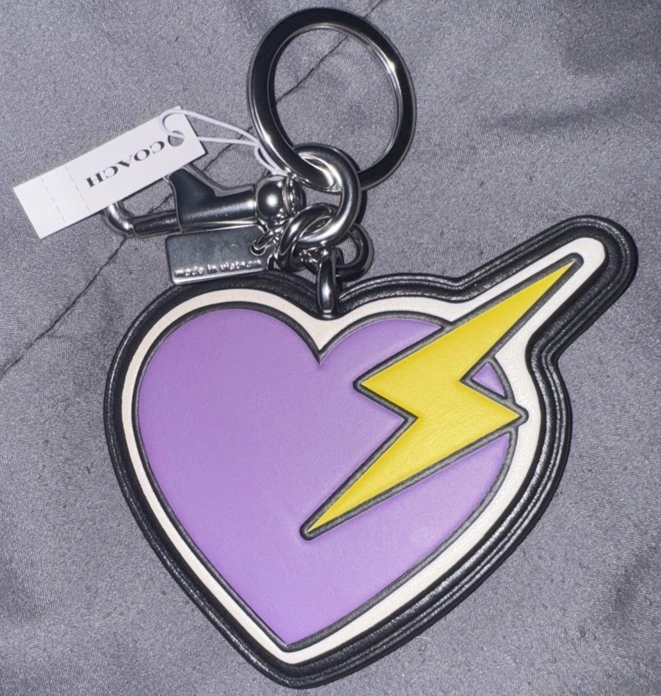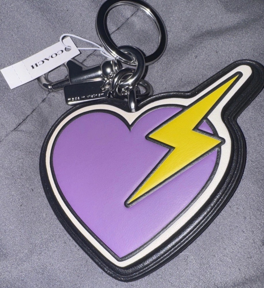 The NWT Coach Leather Heart Lightning Bolt Key Chain Fob is a stylish and charming accessory designed for women. Made from high-quality leather in a vibrant purple color, this key chain features a heart motif, adding a touch of personality to any bag or set of keys. The iconic Coach brand and unique lightning bolt detail make it a standout piece, perfect for those looking to add a touch of flair to their everyday essentials.