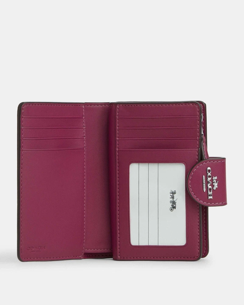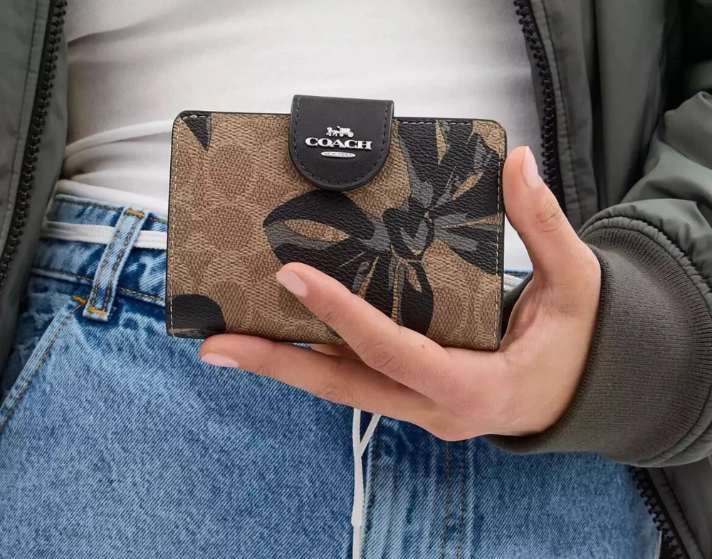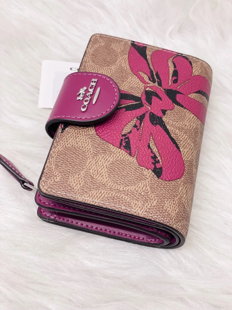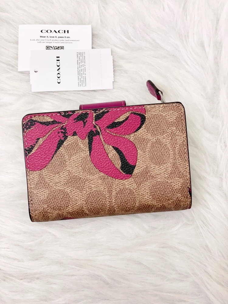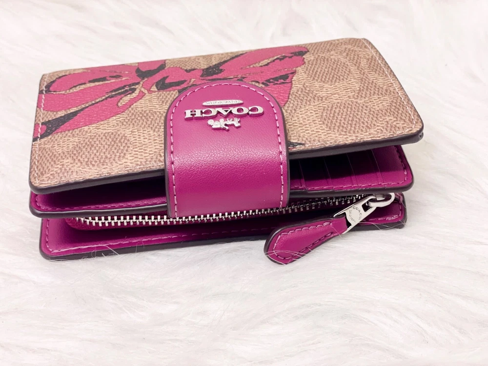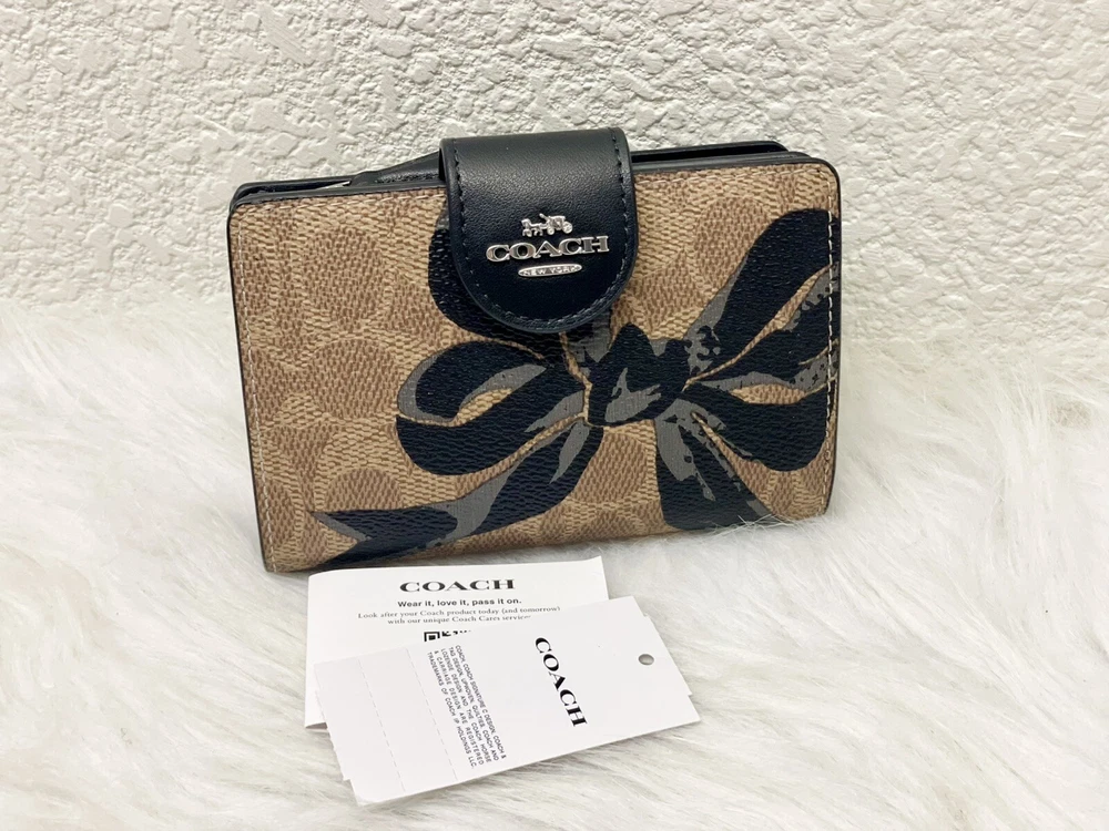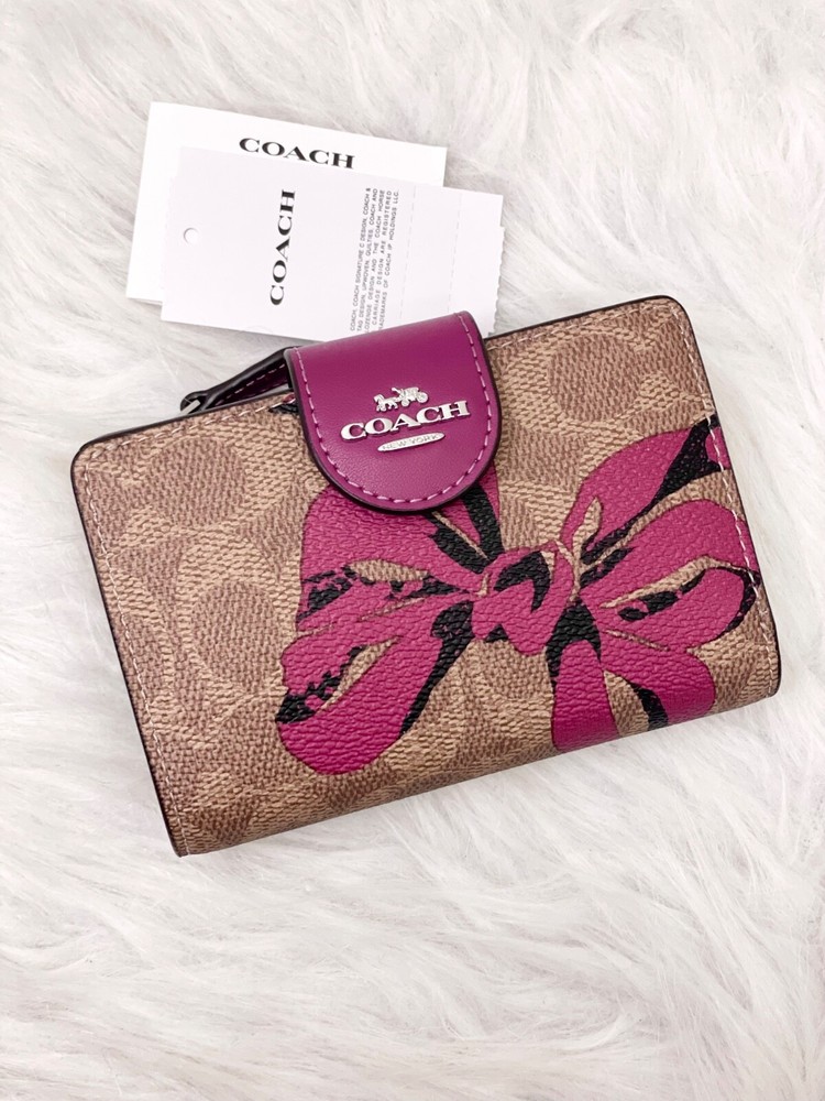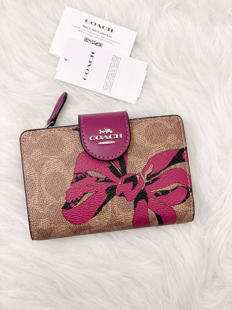 NWT COACH SIGNATURE BOW CORNER ZIP MEDIUM WALLET Fast shipping Brand new with tags 100% Authentic Style Number CZ340 Measurements Length: 5.0" Height: 3.5" Width: 0.5" Materials Signature coated canvas Features Zip coin pocket Seven credit card slots Snap closure Bill compartment Additional Details ID window Price is firm *NOTE: Bow print is randomly arranged, so each wallets may look slightly different m