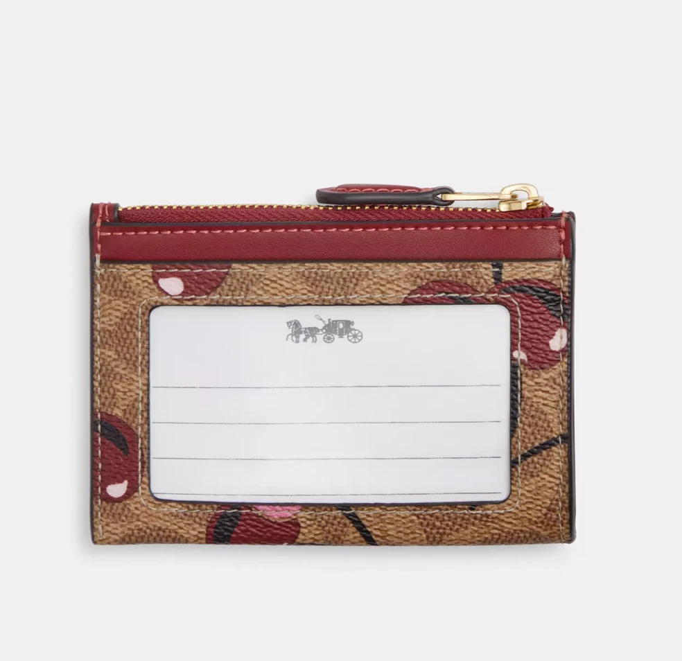 signature canvas/Gold/Tan Multi Product Details Style Number CZ462 Measurements Length: 4.0" Height: 3.0" Materials Smooth leather Features Two credit card slots Zip-top closure Attached split key ring The placement of the cherry print may vary