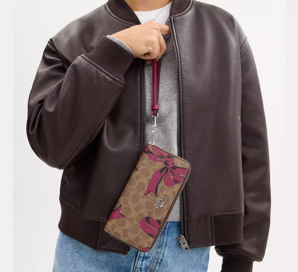 placement of the ribbon prints may vary Silver/Tan/Pink Multi Style Number CZ326 Measurements Length: 7.5" Height: 4.0" Width: 1.0" Materials Signature coated canvas Strap Detachable wrist strap Features Inside zip coin pocket 12 credit card slots Zip-around closure Full-length bill compartments Fits all iPhone and Samsung Galaxy phones