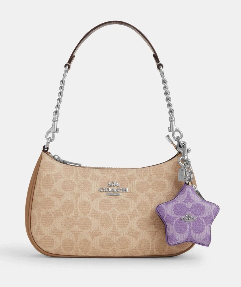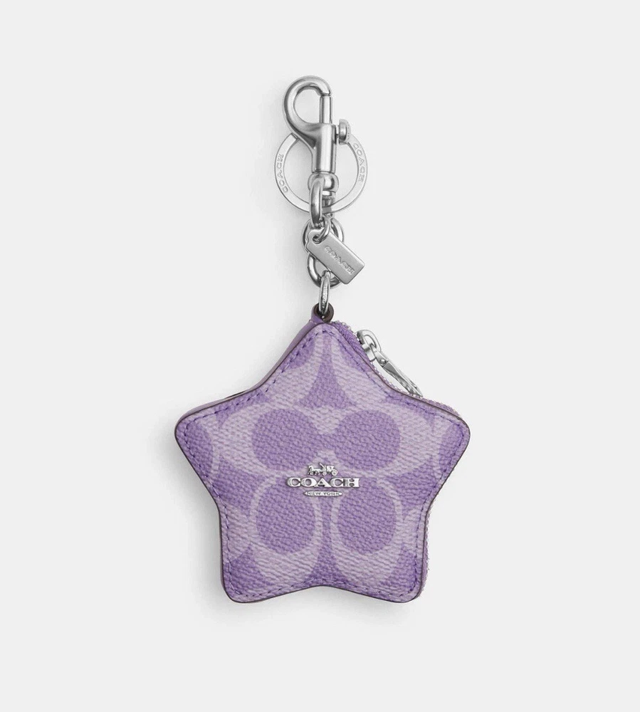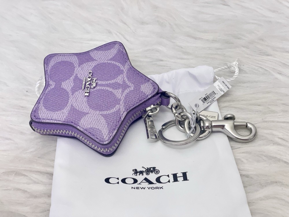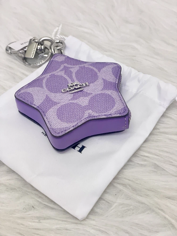 Coach Star Bag Charm In Signature Canvas Brand new with tags 100% Authentic Come with small dust bag Color: Silver/ Iris Style Number: CBL12 Measurements Length: 3.5" Height: 3.25" Width: 0.75" Materials Signature coated canvas and smooth leather Fabric lining Features Zip closure Attached dogleash clip Price is firm