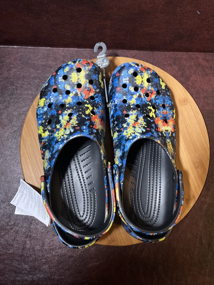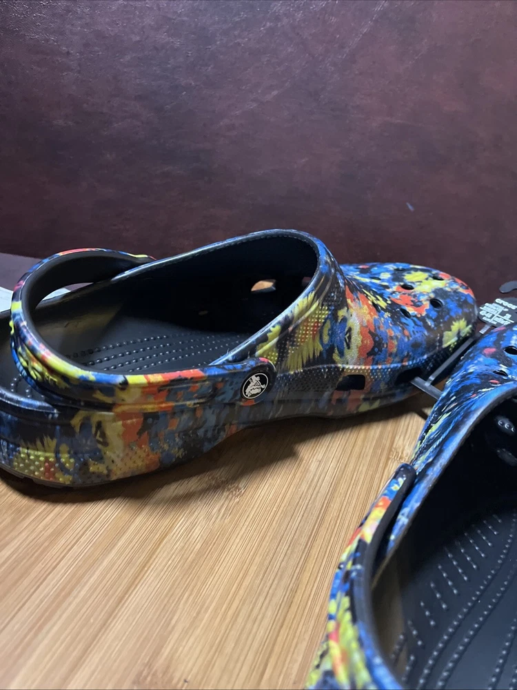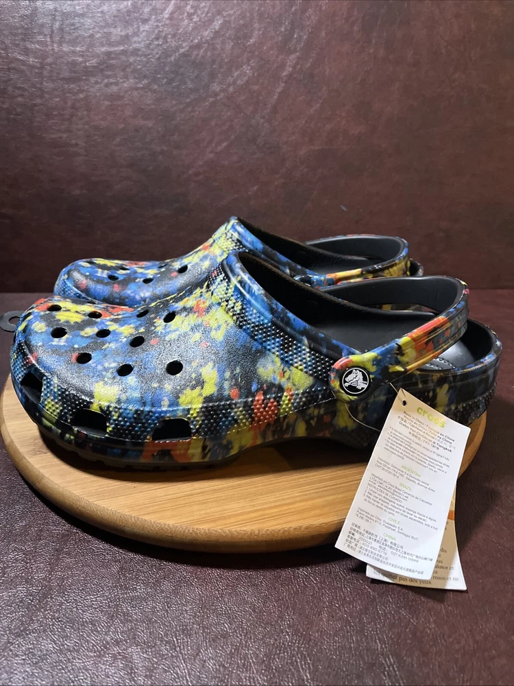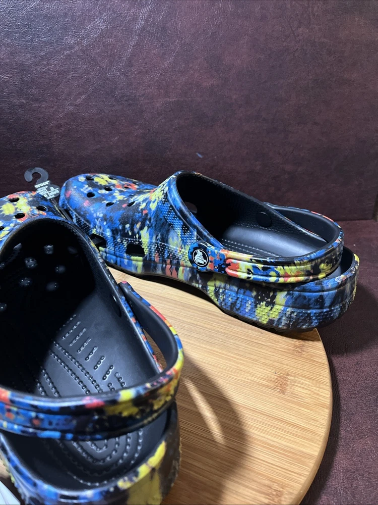 The NWT Crocs Classic Cyber Beach Clog in black multicolor splash is a unisex shoe designed for both men and women in size Mens 11 / Womens 13. This slip-on clog features a closed toe design with a paint splash pattern, accented with the Crocs logo, making it a stylish and comfortable choice for casual wear, travel, or activewear. The shoe is lightweight, breathable, and features an ankle strap for added comfort and support, suitable for outdoor activities and everyday wear in any season.